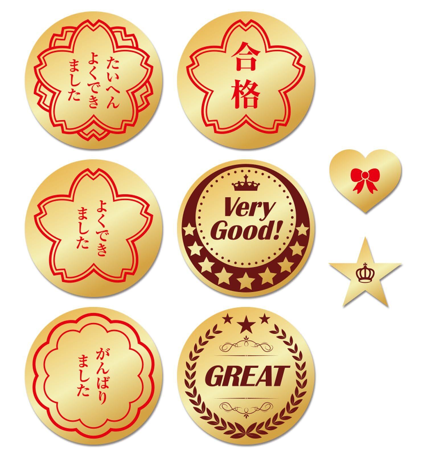 【サイズ・バリエーション】 1シートに丸型・星・ハート型の金色シールを75枚配置、合計150枚セット。「がんばりました」「合格」「GREAT」などのAタイプと「やったね!」「すごい!」「Good job!」などBタイプの2種類。シートサイズ:約20.7×17.2cm。