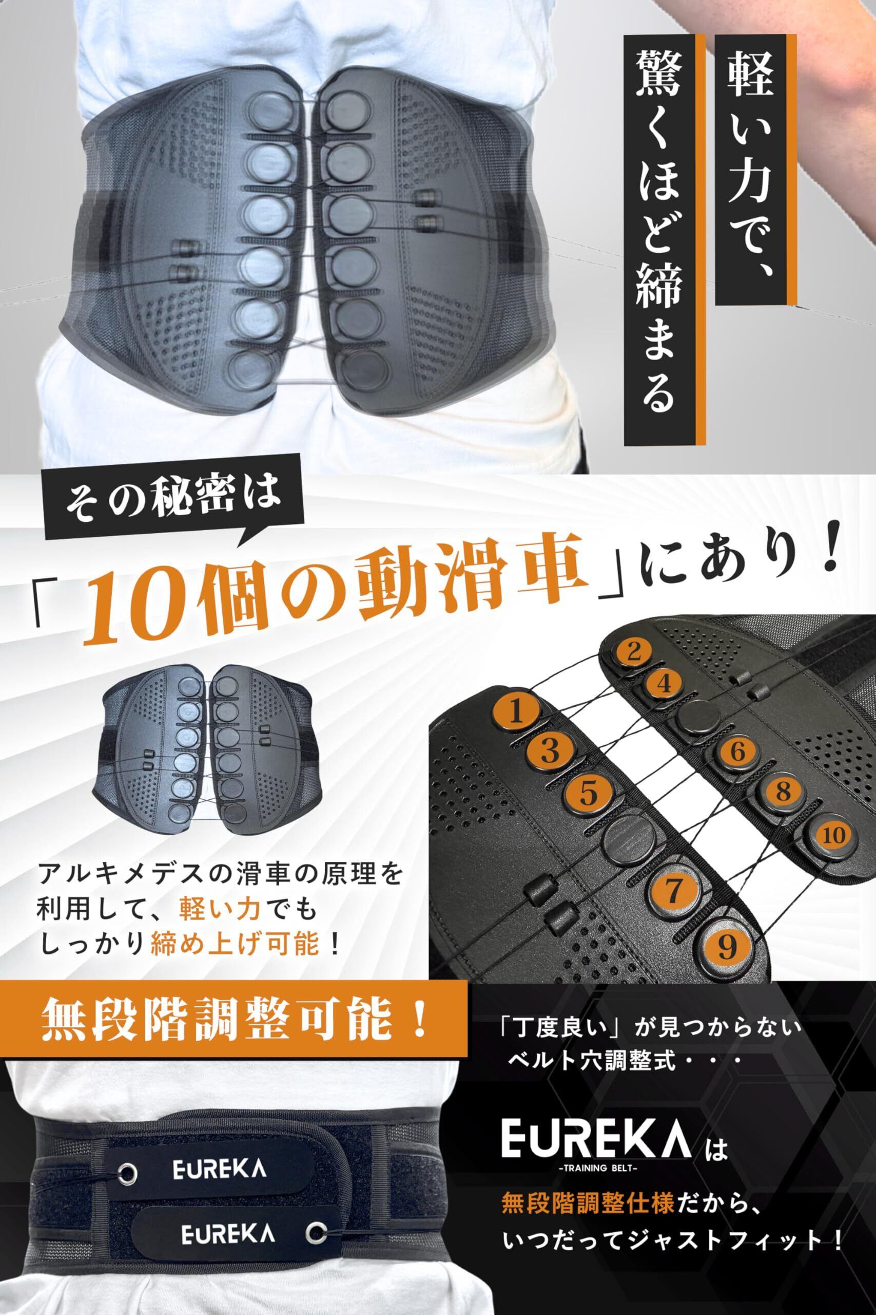 【商品コンセプト】 トレーニングベルトを使ってみたいけれど、大きいものは持ち運びに困るし、革製品は洗えないから不衛生。そのような悩みを解決できる「軽くて」、「衛生的」なトレーニングベルトを「機能性」を損なうことなく、作りたい!という想いからEUREKAは生まれました。