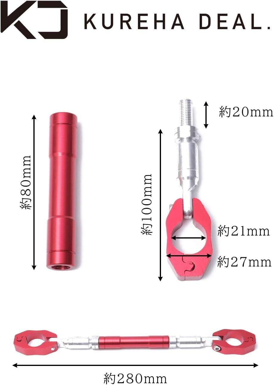 【 ハンドルブレースの効果とは? 】 ハンドルブレースの効果は、ハンドルの「剛性を上げる」のは目的です。特にオフロードバイクによく使用されています。オフロードバイクのハンドルは幅が広く高さもあります。衝撃が伝わりやすくなっております。そのため、ハンドルブレースを使用する方が多いです。もちろんオフロードバイク以外のバイクにも使用可能です!ネイキッドバイクなど使用する方も増えていますね近年では、スマホホルダー止めやアクセサリーとしても使用する方も多いです!「KUREHA DEAL」製のハンドルブレースは、28cm~33cmまで調節可能となっております。お持ちのバイクハンドルサイズに合わせてご購入下さいませ。