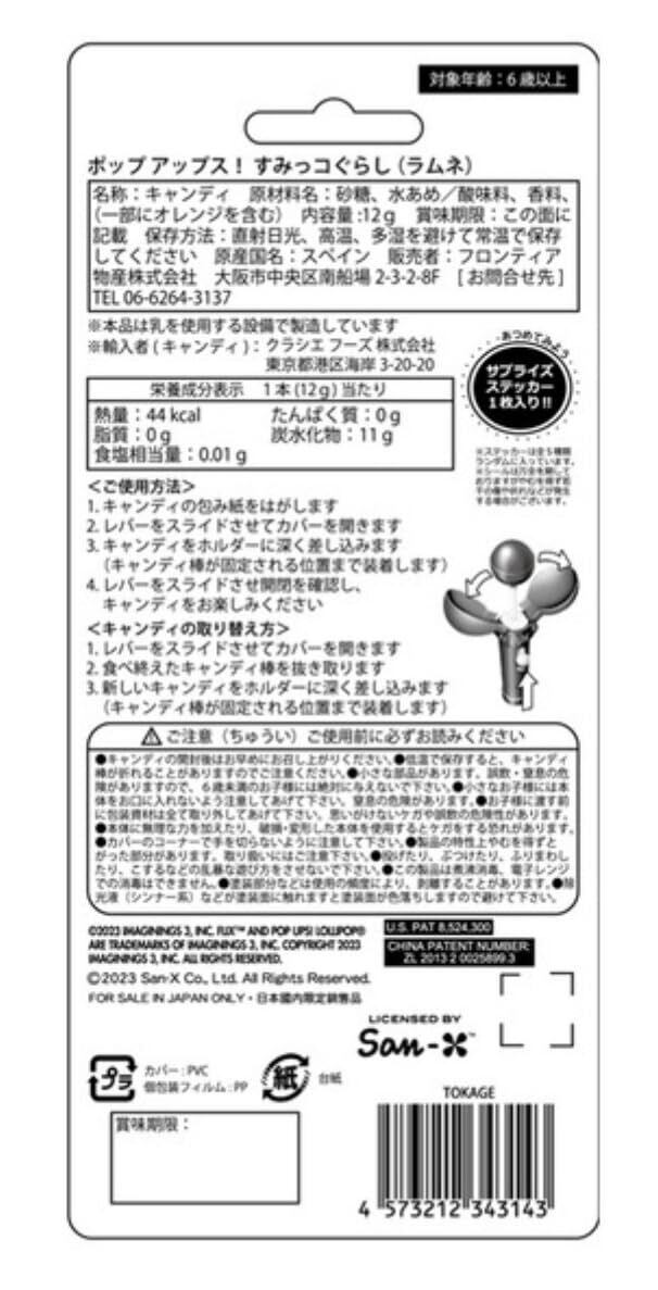 キャラクターのヘッドが付いたキャンディケース「popups!(ポップアップス)」から”すみっコぐらし”のキャラクターがラインアップ! チュッパチャプスを可愛く収納できます。本体の他にラムネ味のチュッパチャプスが1本付いているので、レバーをスライドさせてキャンディを装着すれば完了 いつでもどこでもキャンディをお楽しみいただけます。すみっコぐらし限定で、サプライズステッカー1枚付き。