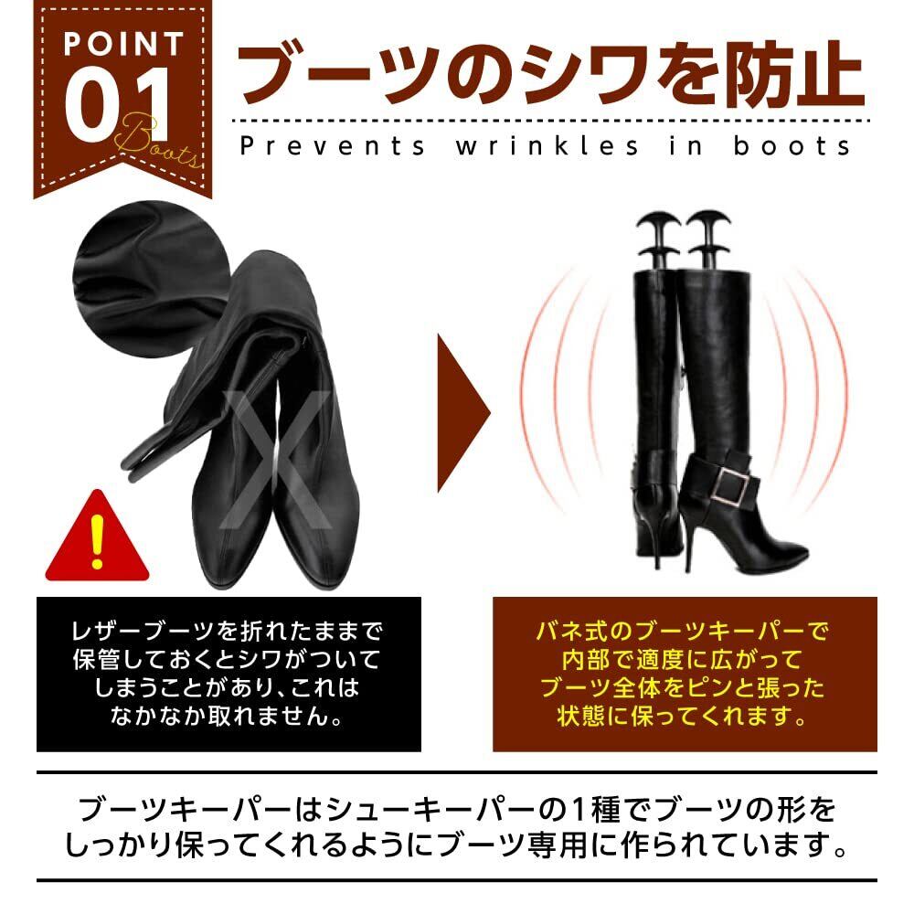 【ブーツの型崩れを防ぐ】ブーツキーパーはシューキーパーの1種で、ブーツの形をしっかり保ってくれるようにブーツ専用に作られています。ショートブーツやロングブーツ, 乗馬ブーツにぴったりと合わせることができます。くたっとしやすい柔らかな素材のものやロング丈のブーツなど型崩れしやすいです。型崩れを防止するためにも、ブーツの形をキープしておくのがブーツキーパーの役割です。ブーツ収納時に活躍します。