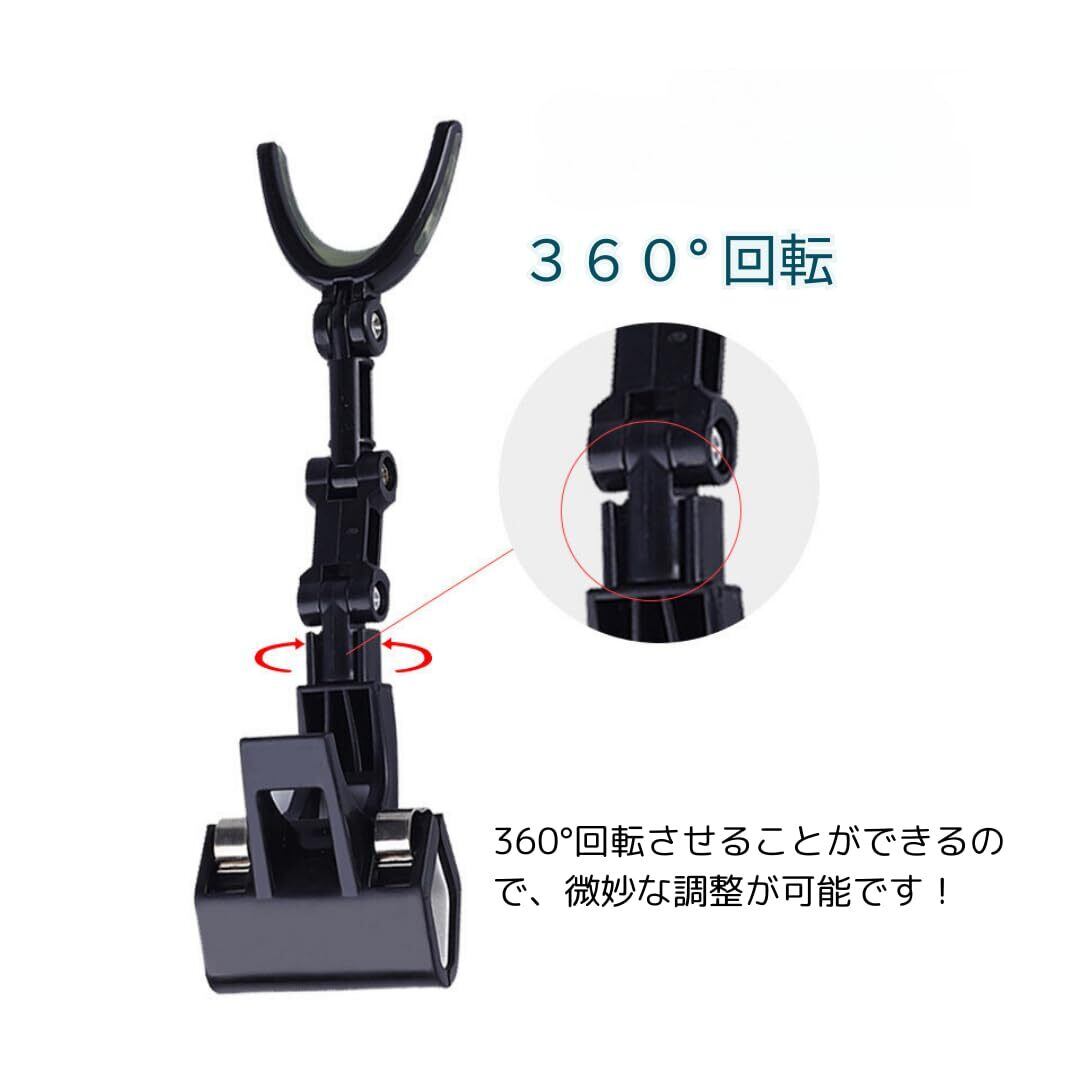 【取付簡単】簡単な取り付け方法で、工具が不要です。ロッドホルダーのクリップを固定するだけで取り付けが完了します。ホルダーの先端は360度回転し、本体は多関節アームを備えており、角度や長さの調整が簡単かつ迅速に行えます。コンパクトなデザインなので、持ち運びも簡単で、場所を取らずに収納できます。