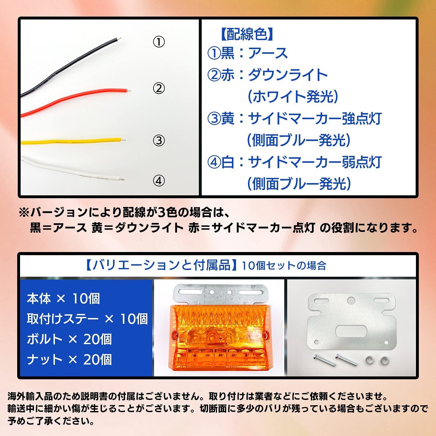 汎用タイプでダウンライト付き、デイライトとしてもご使用いただける高輝度(COB)LEDサイドマーカーになります! DC24Vに対応しているので大型車やトラックにも取り付けでき、明るいランプなので路肩灯や夜間の車幅確認で大活躍です! カラーバリエーションも豊富なのでトラック、ローリー、トレーラー、バス、デコトラなど様々な車種のカスタムやドレスアップ用の社外アイテムとしてもオススメです。 防水処理はされていますがコーキングするとより長くご利用頂けます。 ※破損の原因になるのでネジの締め過ぎにはご注意ください。 【配線】 黒=アース 赤=ダウンライト (ホワイト) 白=弱点灯 (ブルー) 黄=強点灯 (ブルー) ダウンライト、 側面発光は独立させて発光させたり同時発光をさせることができます! ※配線が3色の場合は、黒=アース、黄=ダウンライト、赤=サイドマーカー、になります。 【付属品】 本体、 取付けステー、ボルト、ナット ※10個セットと4個セットをご用意しているので、ご希望の個数をバリエーションからお選びください。 【側面発光カラー】 ホワイト(クリア)/オレンジ/ブルー/グリーン ※アンダー(ダウン)ライトはホワイトになります。