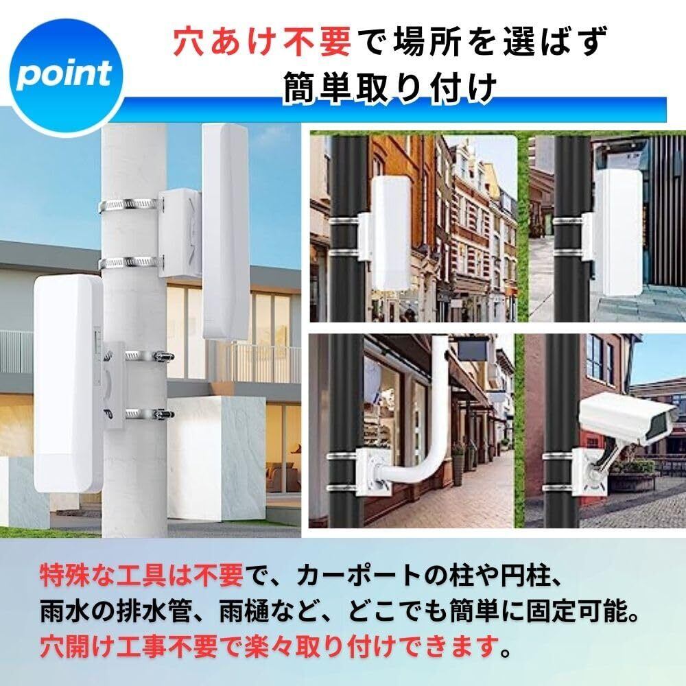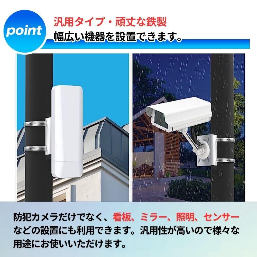 【穴あけ不要で場所を選ばず簡単取り付け】特殊な工具は不要で、カーポートの柱や円柱、雨水の排水管、雨樋など、どこでも簡単に固定することができます。穴開け工事は必要ありませんので、手軽に取り付け可能です。防犯カメラだけでなく、街灯、看板、ミラー、プラボックスなど、穴を開けずに取り付けることができます。室内や屋外で使用できます。