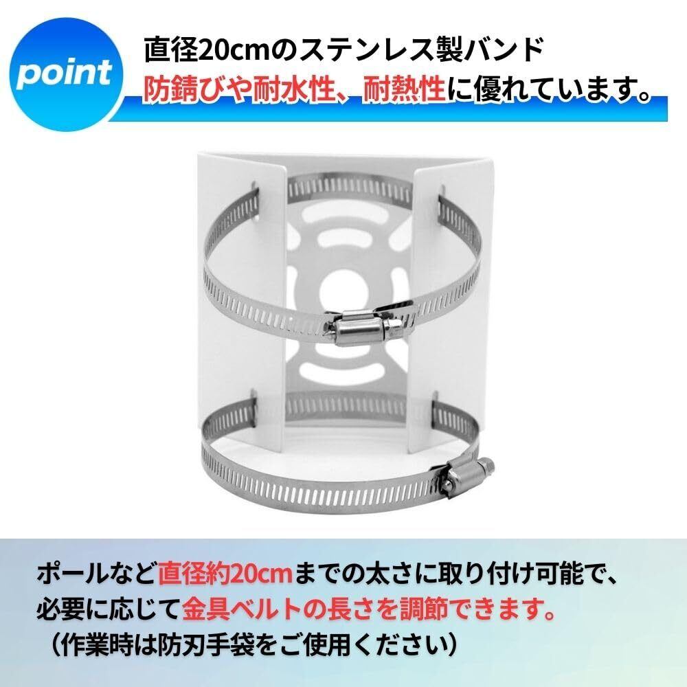 【耐久性に優れたステンレス製】直径20cmのステンレス製バンドが付属しており、防錆びや耐水性、耐熱性に優れています。長期間使用しても安心してご利用いただけます。ポールなど直径約20cmまでの太さのものに取り付け可能であり、必要に応じて金具ベルトの長さを調節できます(作業時は防刃手袋をご使用ください)。
