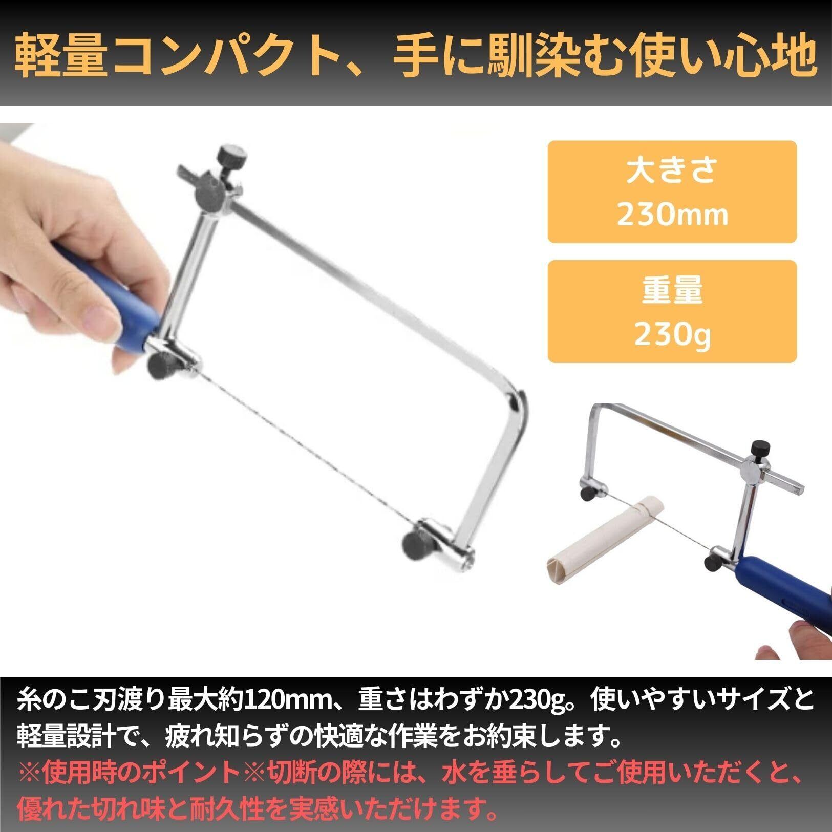 【仕様】サイズ:糸のこ刃渡り(最大):約180mm 懐深さ:約80mm 糸のこ持ち手:約100mm 重さ:230g 付属品:替刃 超極細ダイヤモンドワイヤー Φ0.15mm Φ0.25mm Φ0.35mm 各1m