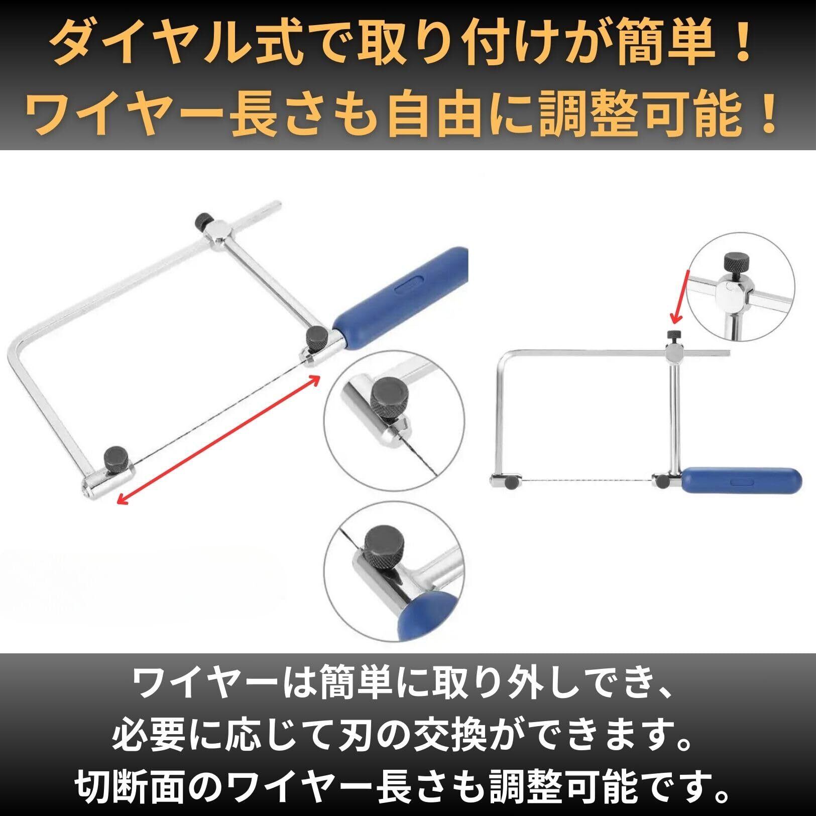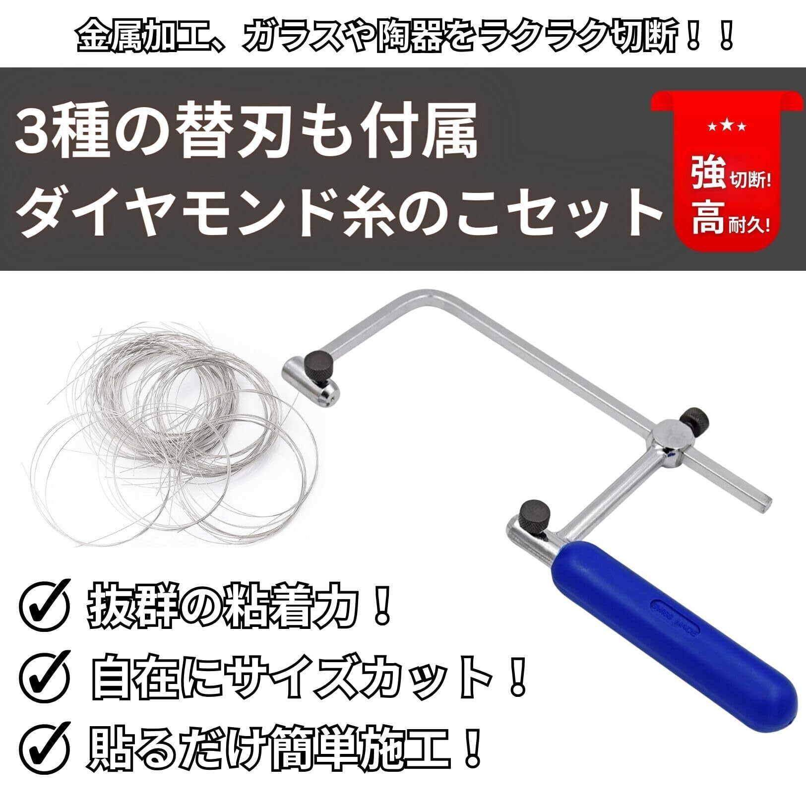 【ダイヤモンドワイヤーの切れ味が光る、ガラスや陶器をラクラク切断!3種の替刃で多彩な用途に対応、使いやすい糸鋸セット!】高品質なダイヤモンドワイヤーと替刃がセットになった、ガラス、陶器、石細工に最適な糸鋸(糸のこ)です。切断用途において優れたパフォーマンスを発揮し、3種類の替刃ワイヤーが各1メートルずつ付属しています。