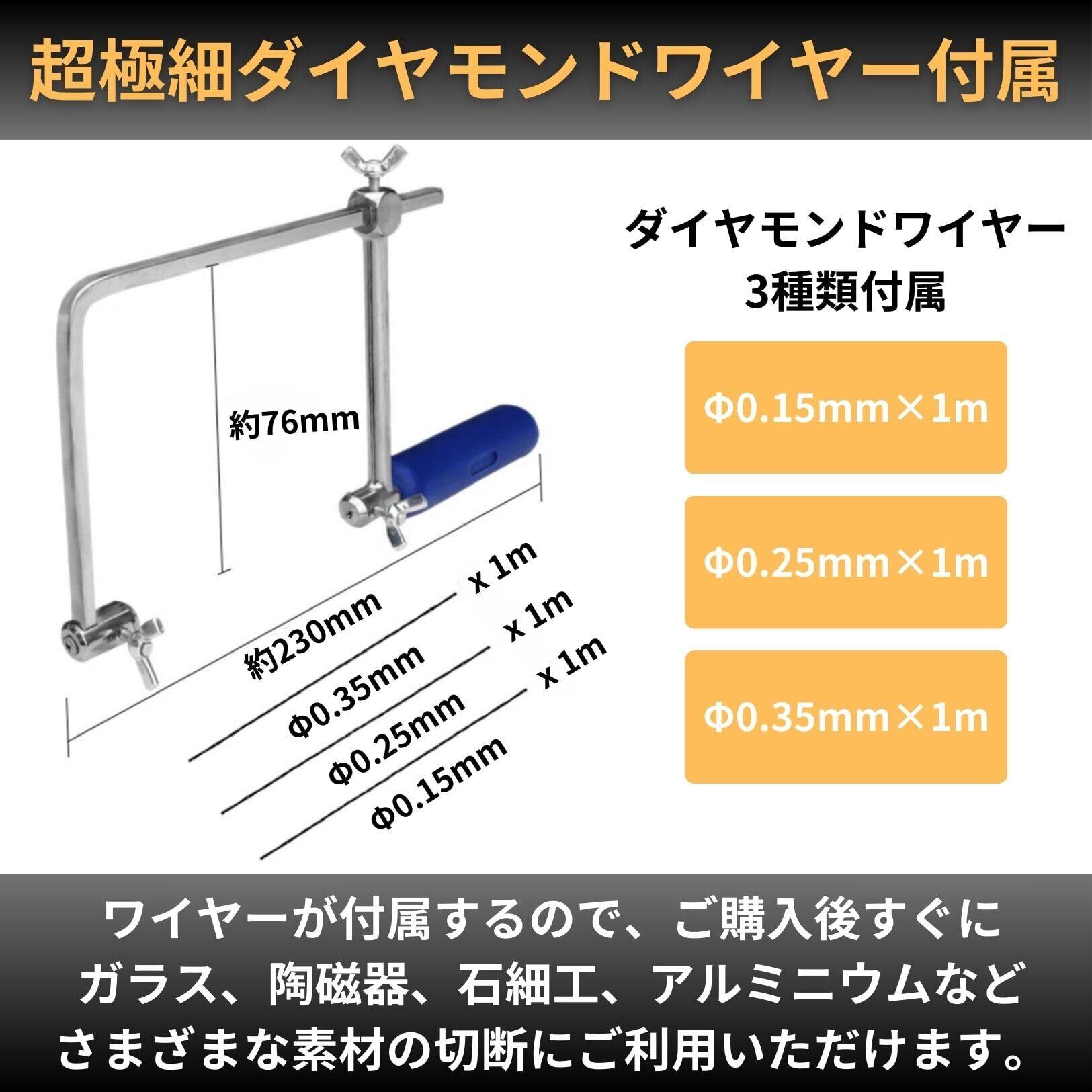 【付属の超極細ダイヤモンドワイヤーで更なる可能性を】付属品には超極細ダイヤモンドワイヤーΦ0.15mm、Φ0.25mm、Φ0.35mmそれぞれ1メートルずつ含まれています。これにより、ガラス、陶磁器、石細工、アルミニウムなど、さまざまな素材の切断作業に幅広くご利用いただけます。