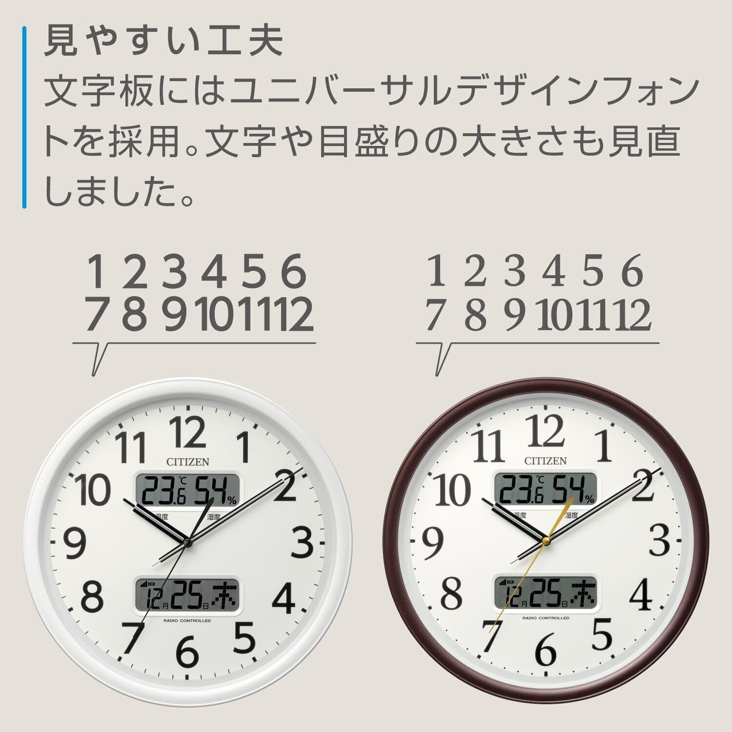 【視認性の高いユニバーサルデザインフォント使用】流行に左右されず長くお使いいただけるよう「視認性」を再度研究。文字、目盛りの太さを見直しました。見やすいユニバーサルデザインフォントを採用した、ロングライフデザインの掛け時計です。