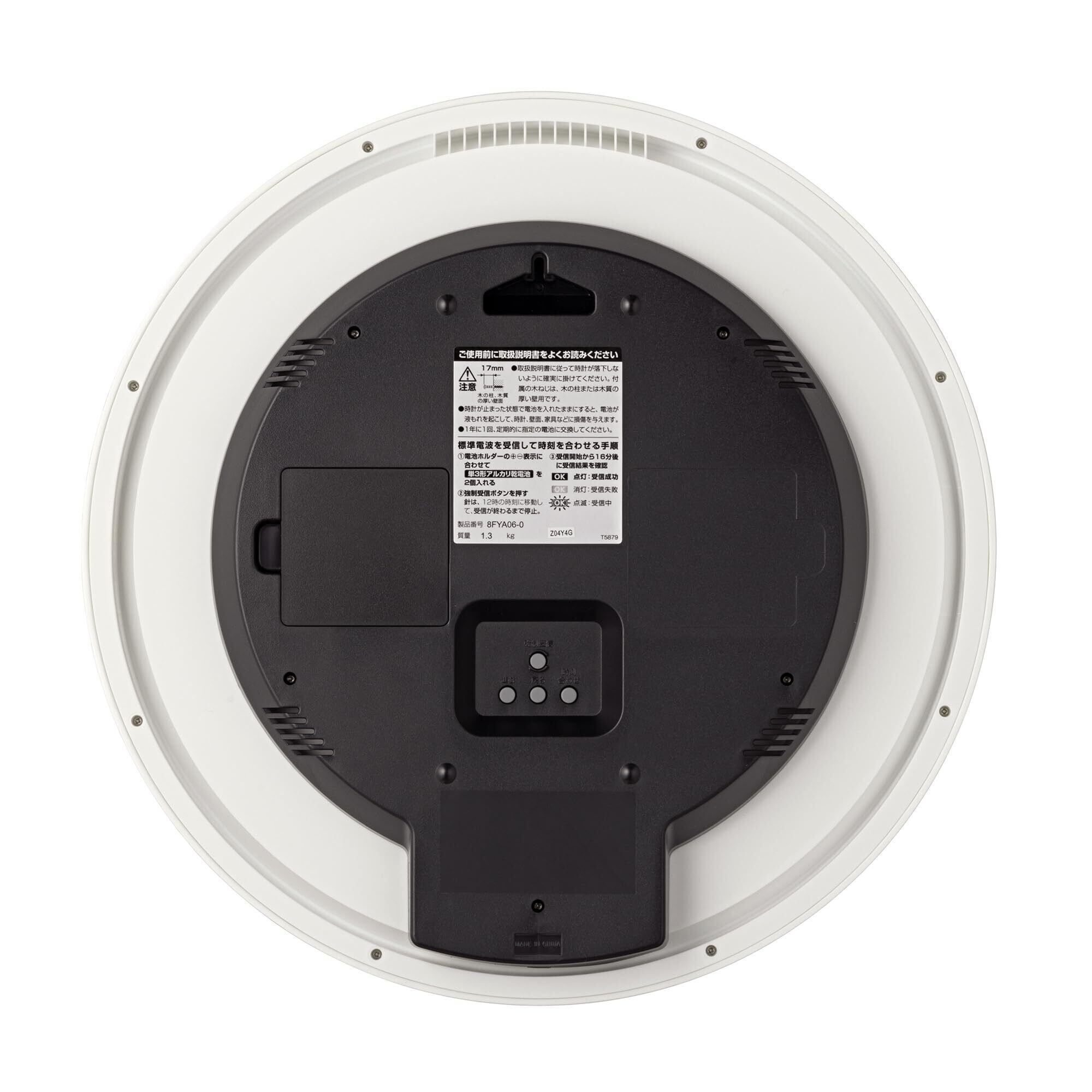 サイズ:35×35×5.6cm 質量:1.3kg 使用電源:単3形×2本(電池別売) ムーブメント:電波時計 機能:連続秒針 温度計(-9.9~49.9℃) 湿度計(20~90%) カレンダー表示(2099年12月31日までプログラム) ユニバーサルデザインフォント使用