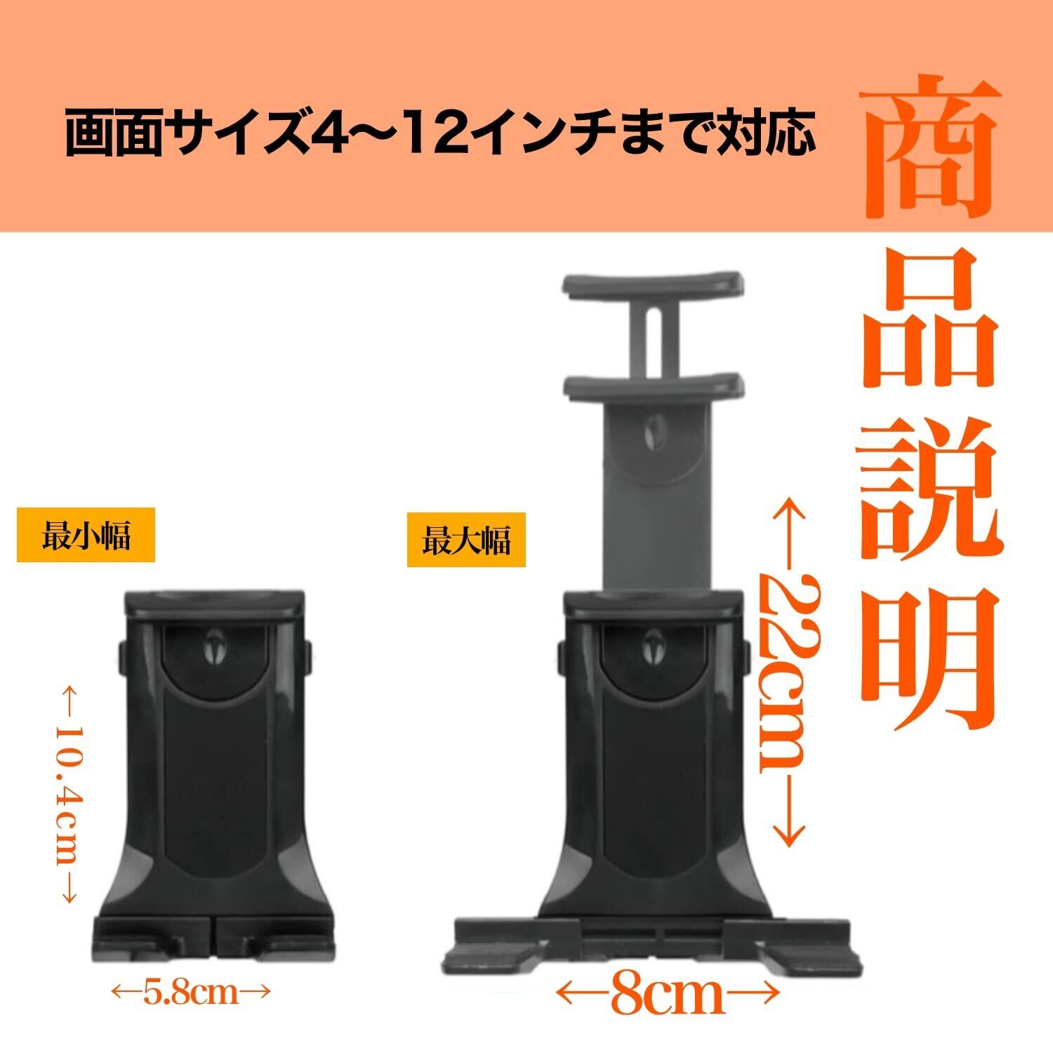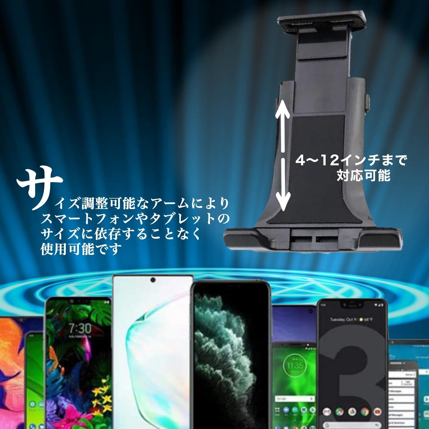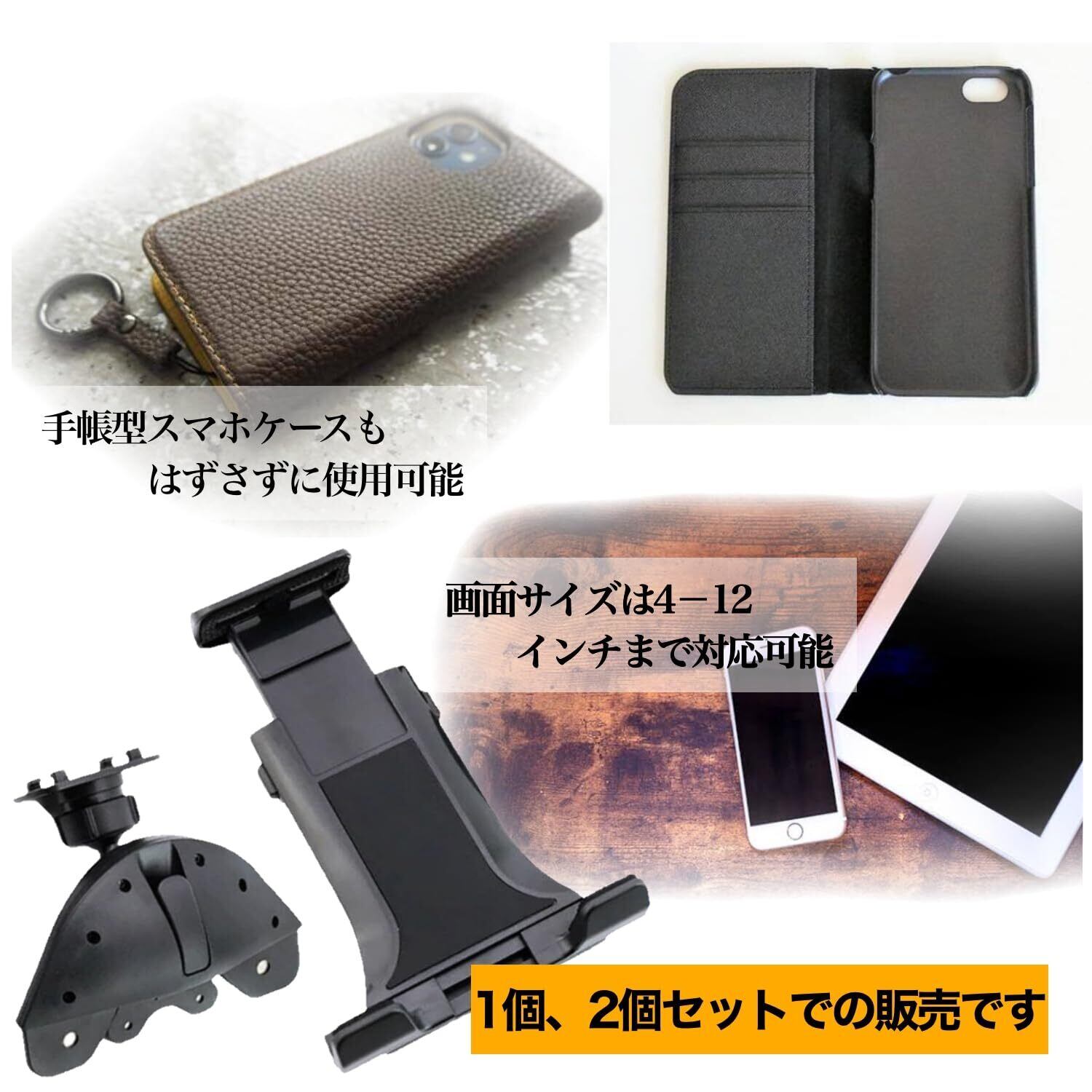 サイズに関係なく利用可能なフレキブルアーム- スマートフォンやタブレットのサイズに依存しないフレキブルアームを採用しました。4-12インチの幅広い画面サイズに対応し、手帳型のケースを装着したままでも問題ありません。様々な機種に適用できるタブレットホルダー 車です。