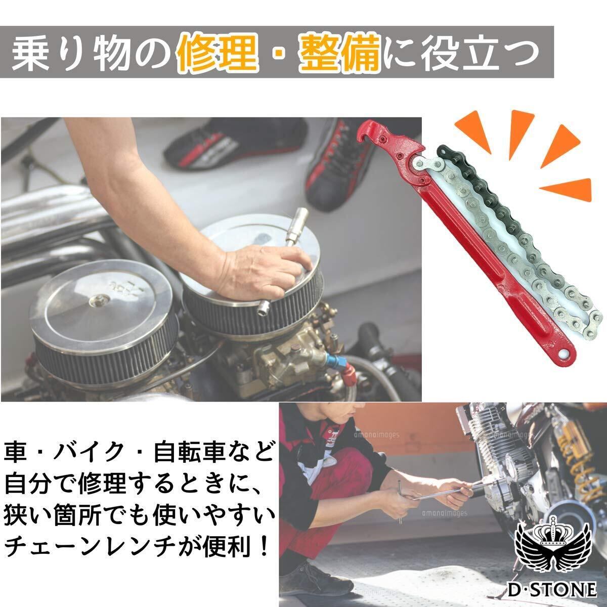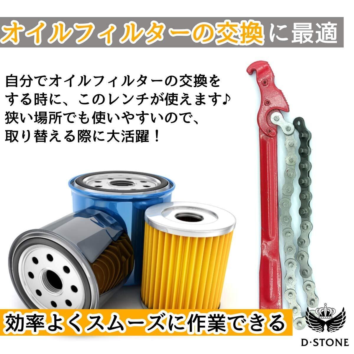 "チェーンの力を利用するチェーン レンチは、様々なサイズに対応で き、オイルフィルターの交換だけ でなく三角、四角の多角形など幅 広い形に使用できます。バイク、 自動車の修理用の工具の必需品で す!"
