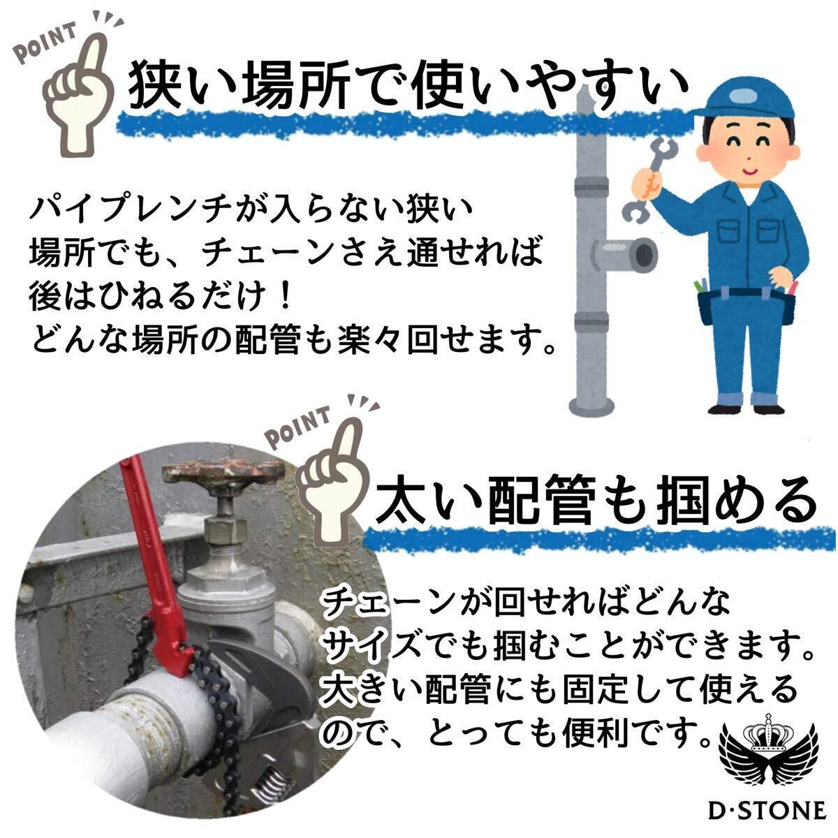 "パイプレンチが使えないような 狭い場所の配管作業もチェーン レンチがあれば簡単に。様々な サイズに対応でき、チェーンが 強力に食い込み大きな力を発揮 します。"