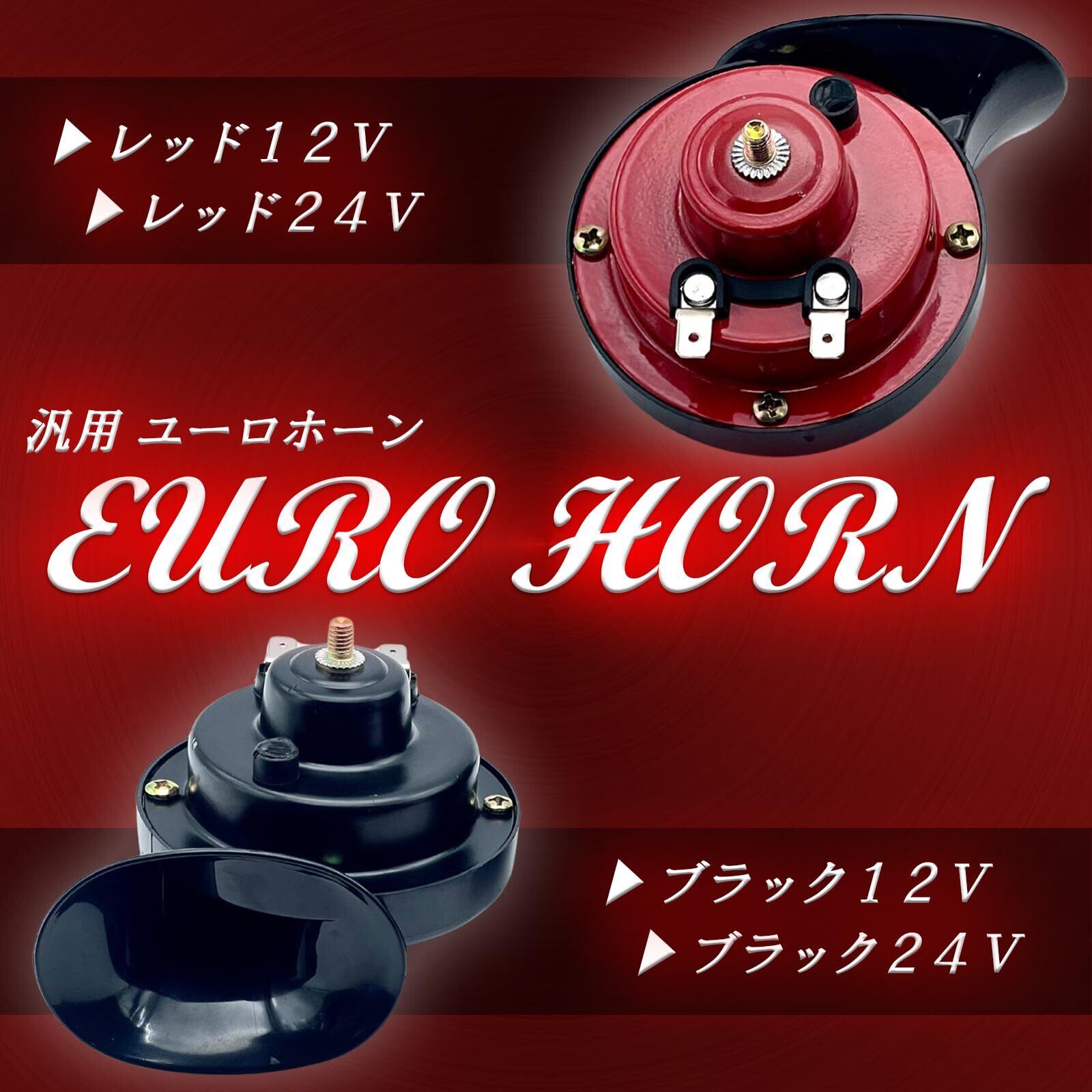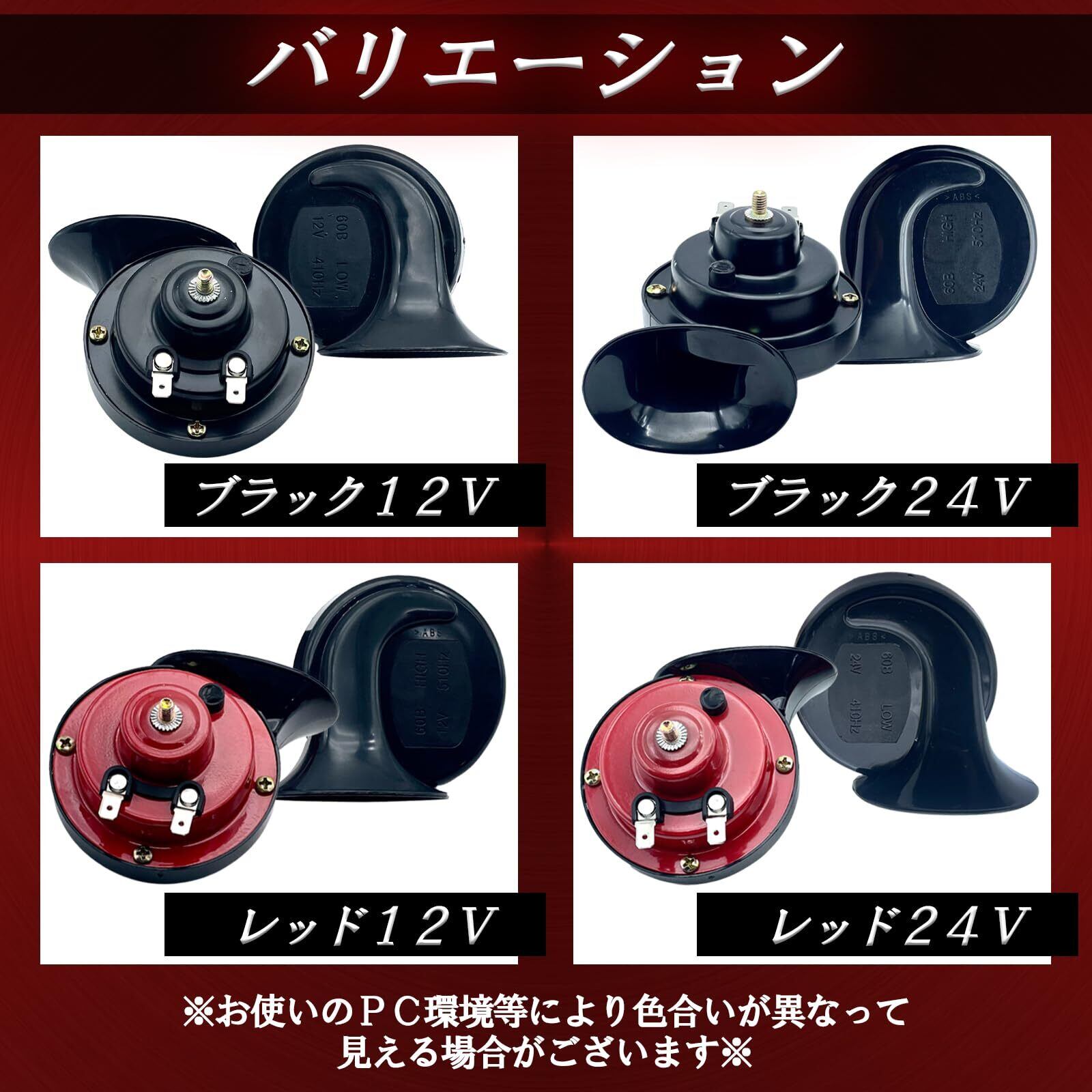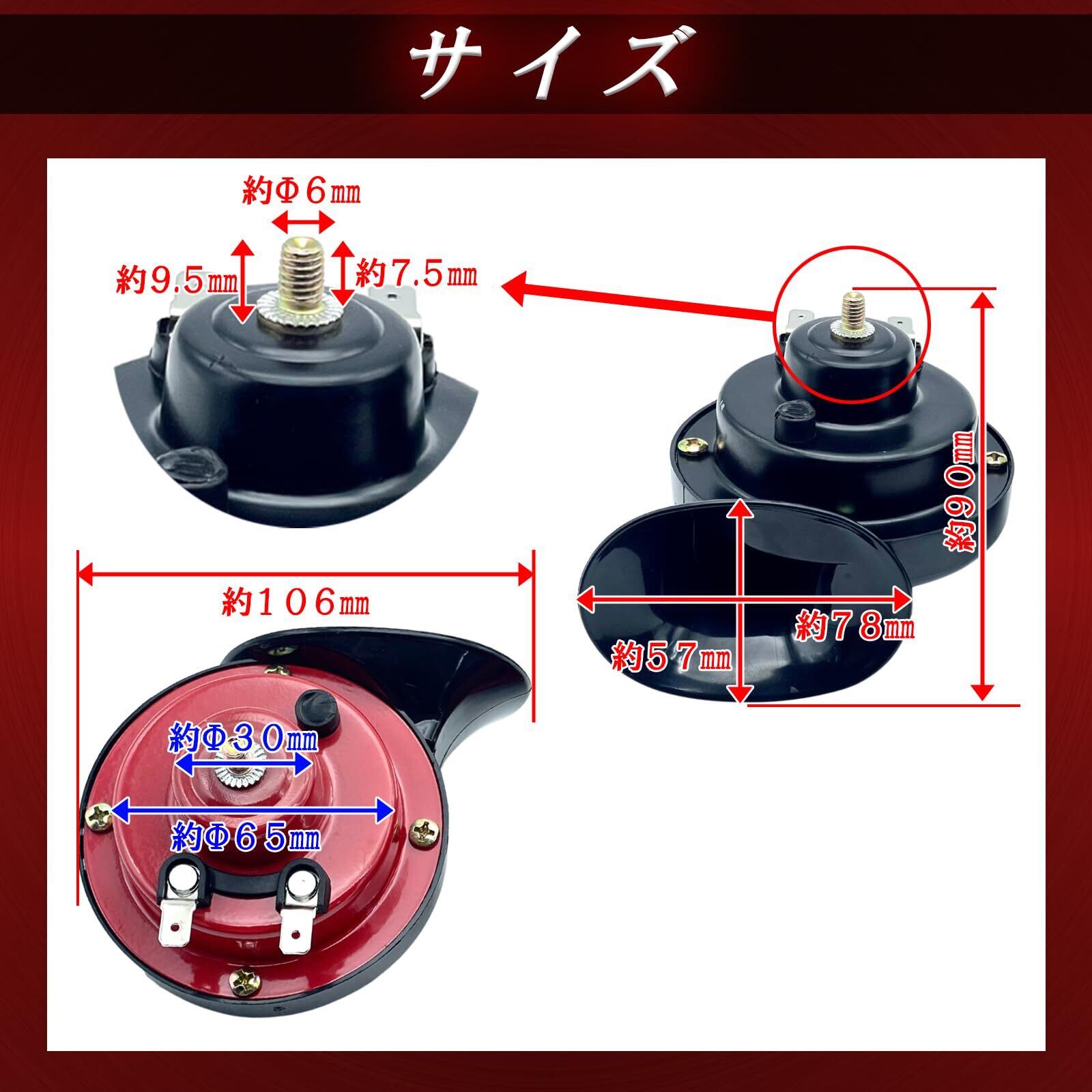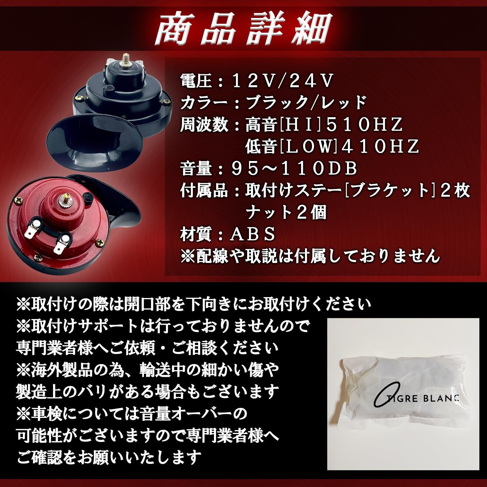 【商品詳細】電圧:12V/24V、カラー:ブラック(黒)/レッド(赤)、周波数:高音(HI)510Hz/低温(LOW)410Hz、音量:95dB~110dB、付属品:取付けステー(ブラケット)2枚、ナット2個、材質:ABS ※配線や取説は付属しておりません。