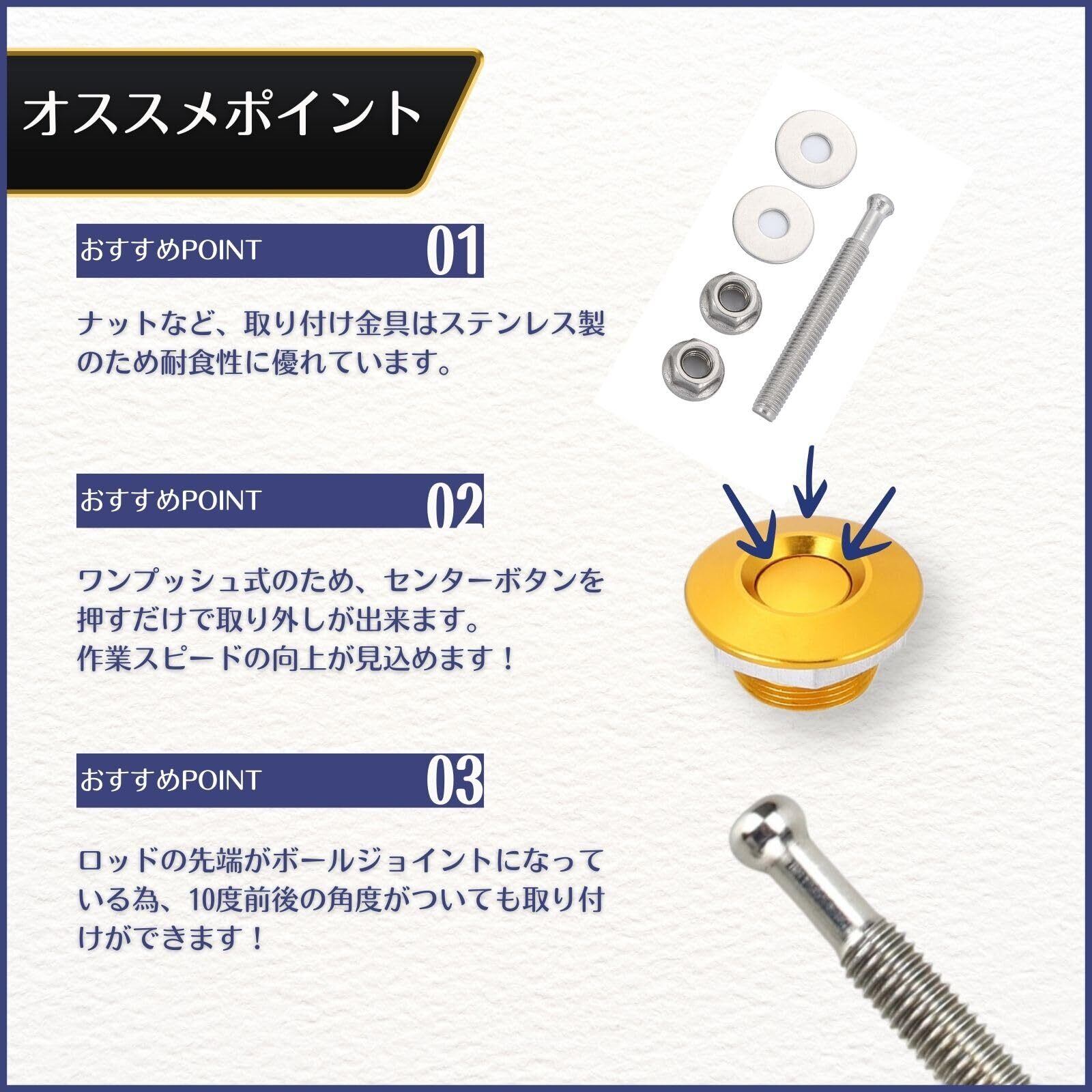 【クイックリリース機能】ワンタッチで簡単に脱着可能なプッシュボタンを採用。ボンネットの開け閉めがスムーズに行え、時間を節約できます。どんなボンネットにもフィットし、使い勝手抜群です。