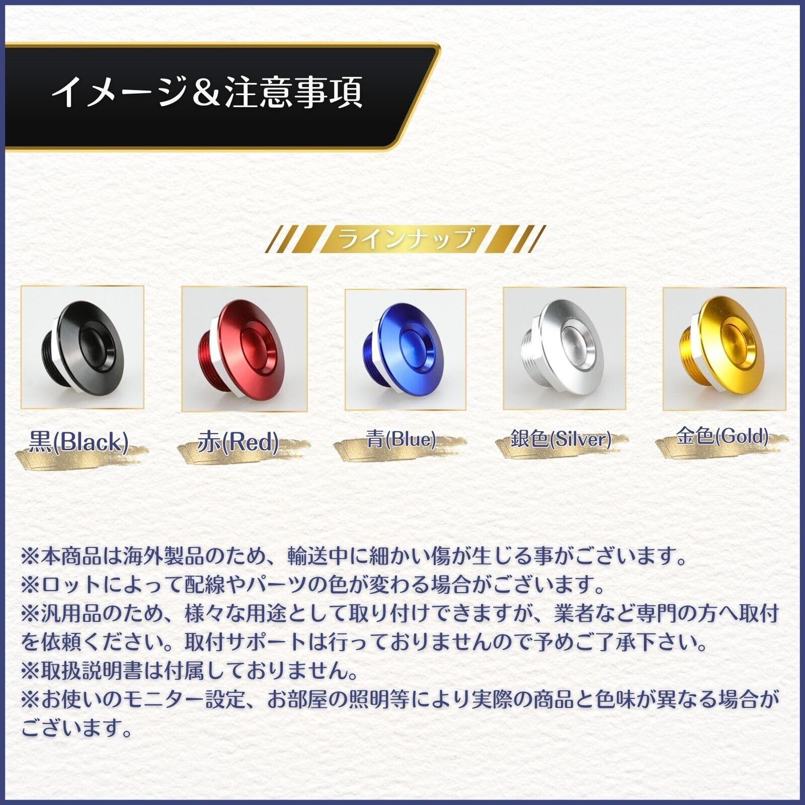 【豊富なカラーバリエーション】5色(黒、赤、青、シルバー、ゴールド)から選べるので、愛車の外観に合わせてカスタマイズ可能。個性を演出し、車の魅力を最大限に引き出します。