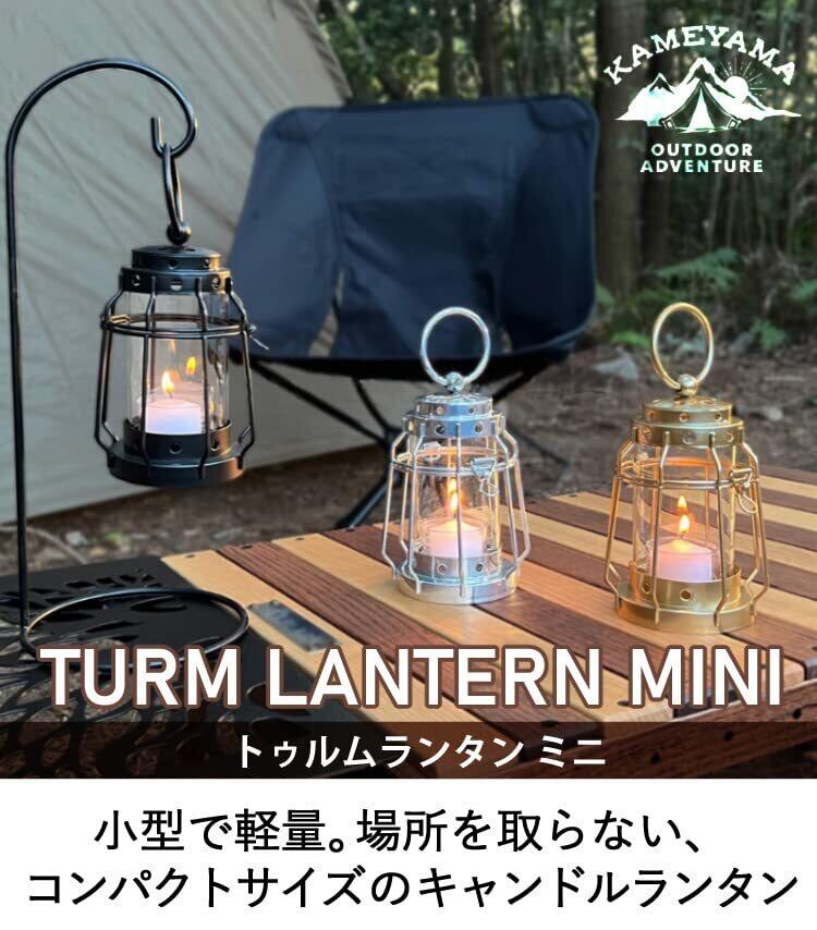 【トゥルムランタンミニ】テーブルの上でも場所を取らない、コンパクトサイズの キャンドル ランタン。「トゥルム」とはドイツ語で「塔」という意味。シンプル かつインダストリアルなデザインで アウトドア シーンを盛り上げます。あかりが主役になるマットブラック、使い込むほどに味が出るツヤ消しゴールド、クールでスタイリッシュなメタリックシルバーの3カラー。フックハンドルは可動式です。従来の350mmタイプと比べて、横風に強いアウトドア仕様に。ランタンスタンドと合わせて室内用の灯りにもぴったりです。