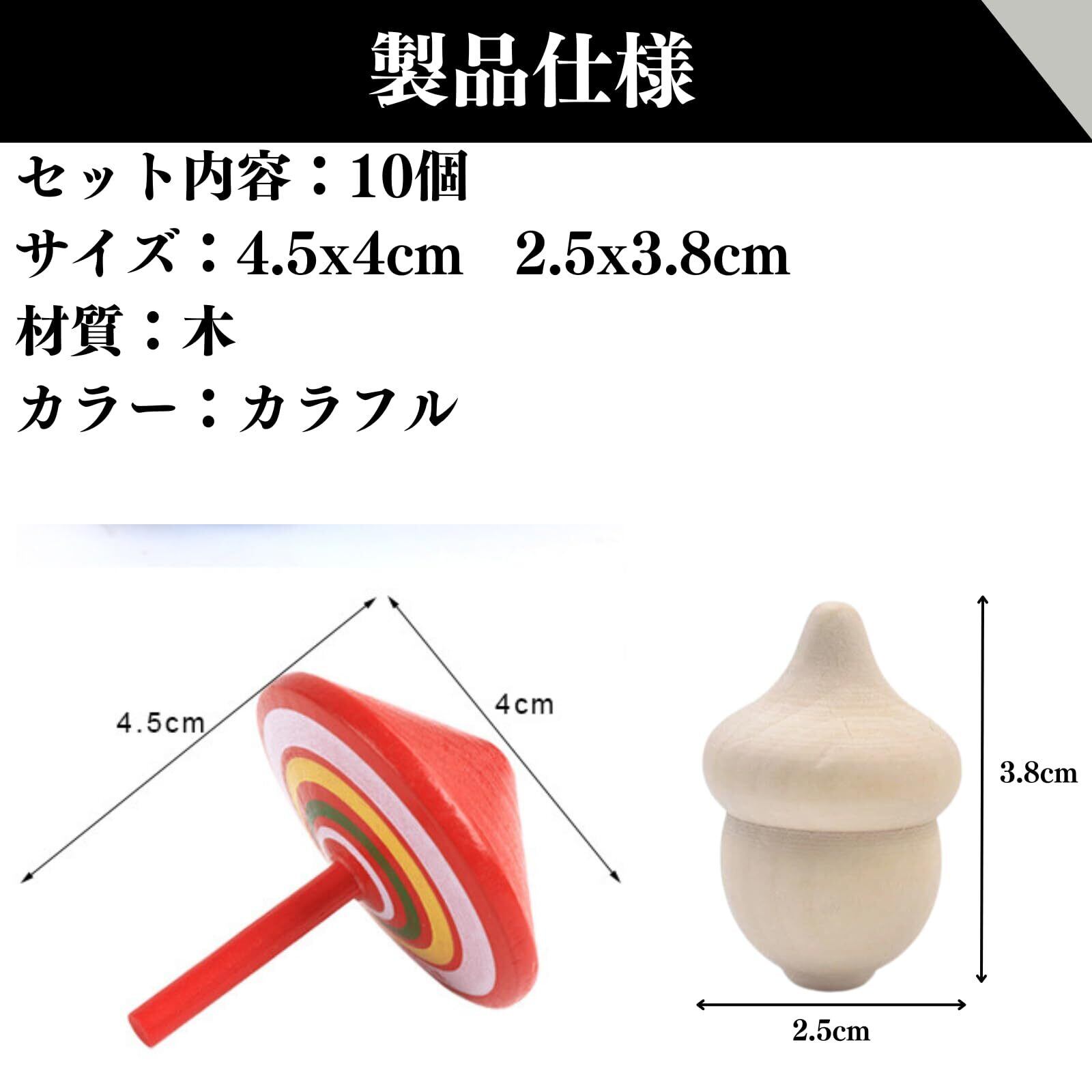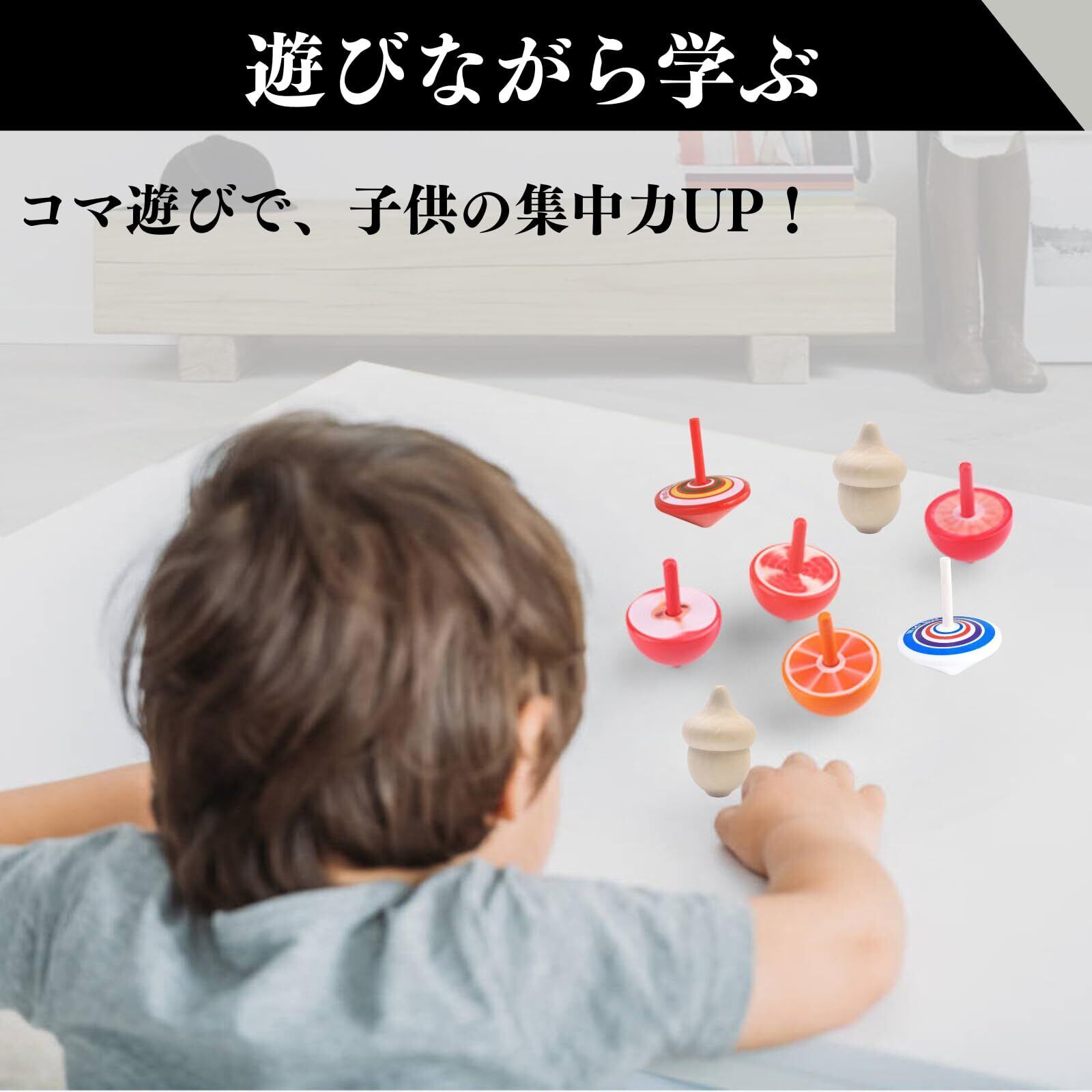 【木製の手回しコマセット】表面は滑らかで、カラフルな色合いがとても愛らしいです。コマで遊ぶことで、子供たちの注意を引きつけ、集中力を高めることができます。