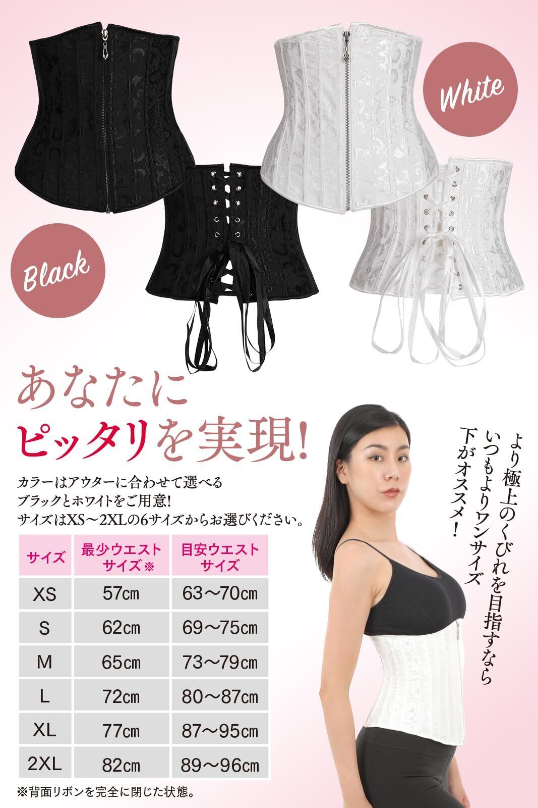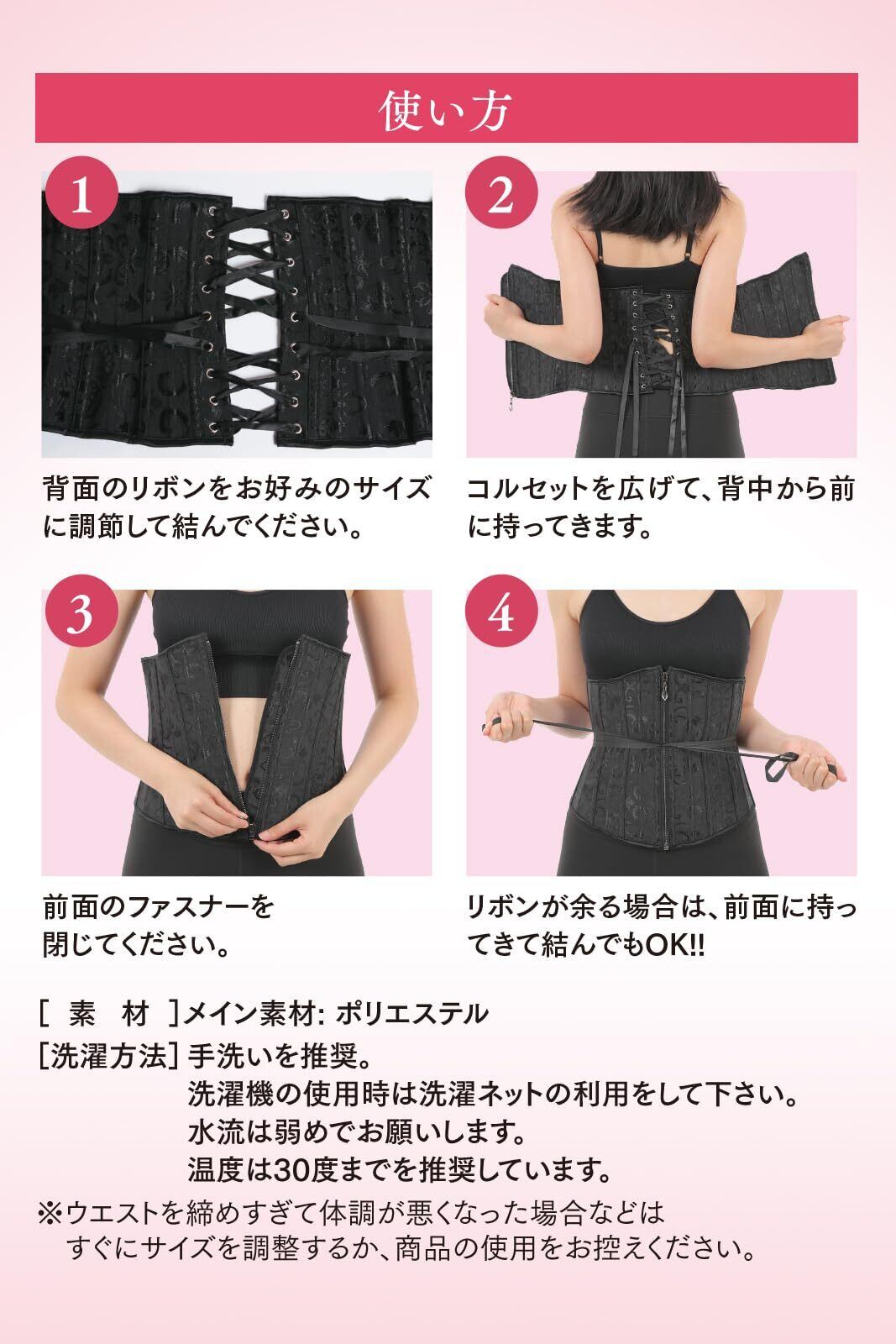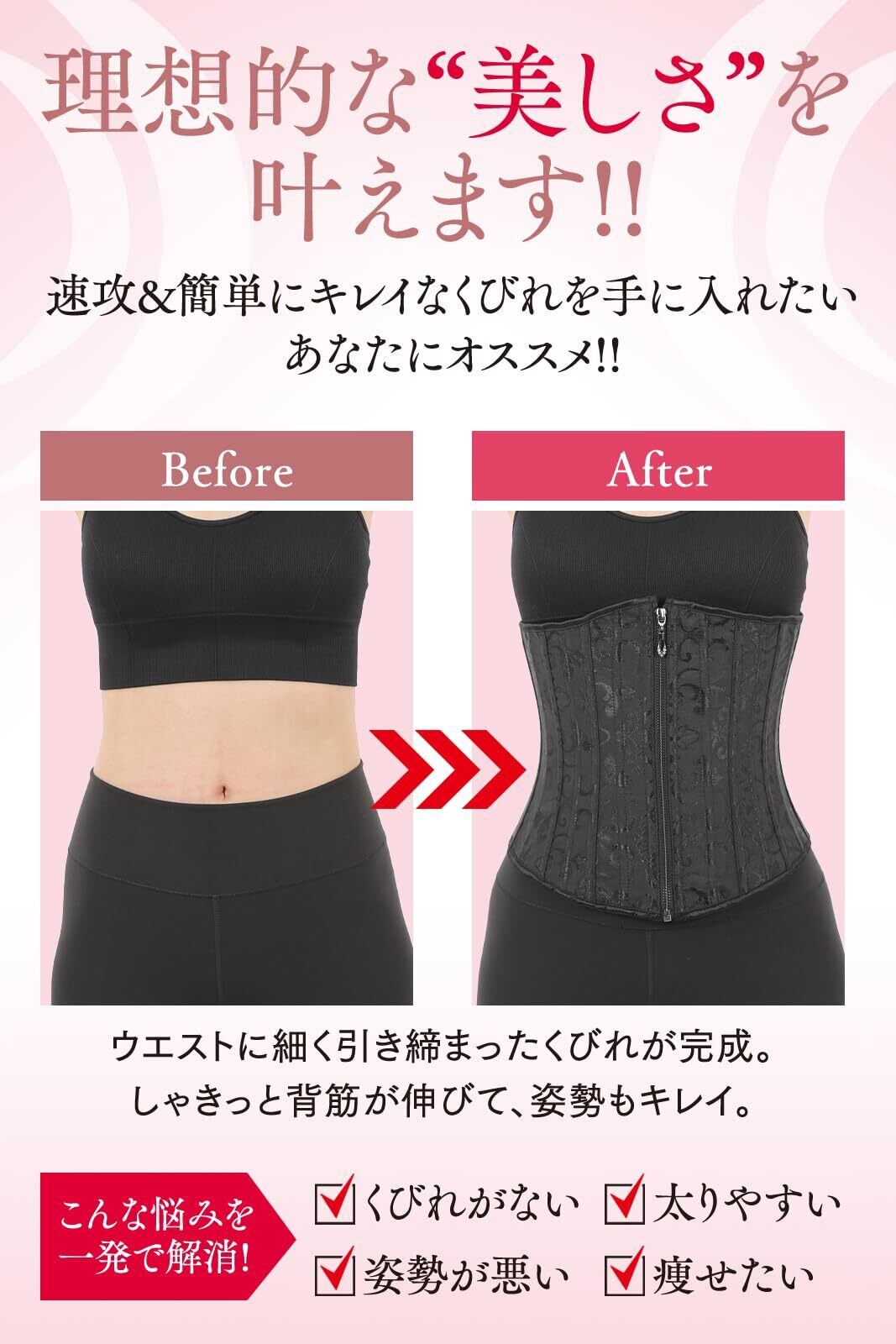 【姿勢よく美しいくびれを作る】コルセットでウエストをきゅっと締め、腰回りのムダ肉すっきり。細く美しいくびれを作ります。背筋が気持ちよく伸び、しゃきっときれいな姿勢に。たるみがちなお腹と背中をシェイプさせ、カロリー消費アップを目指します。