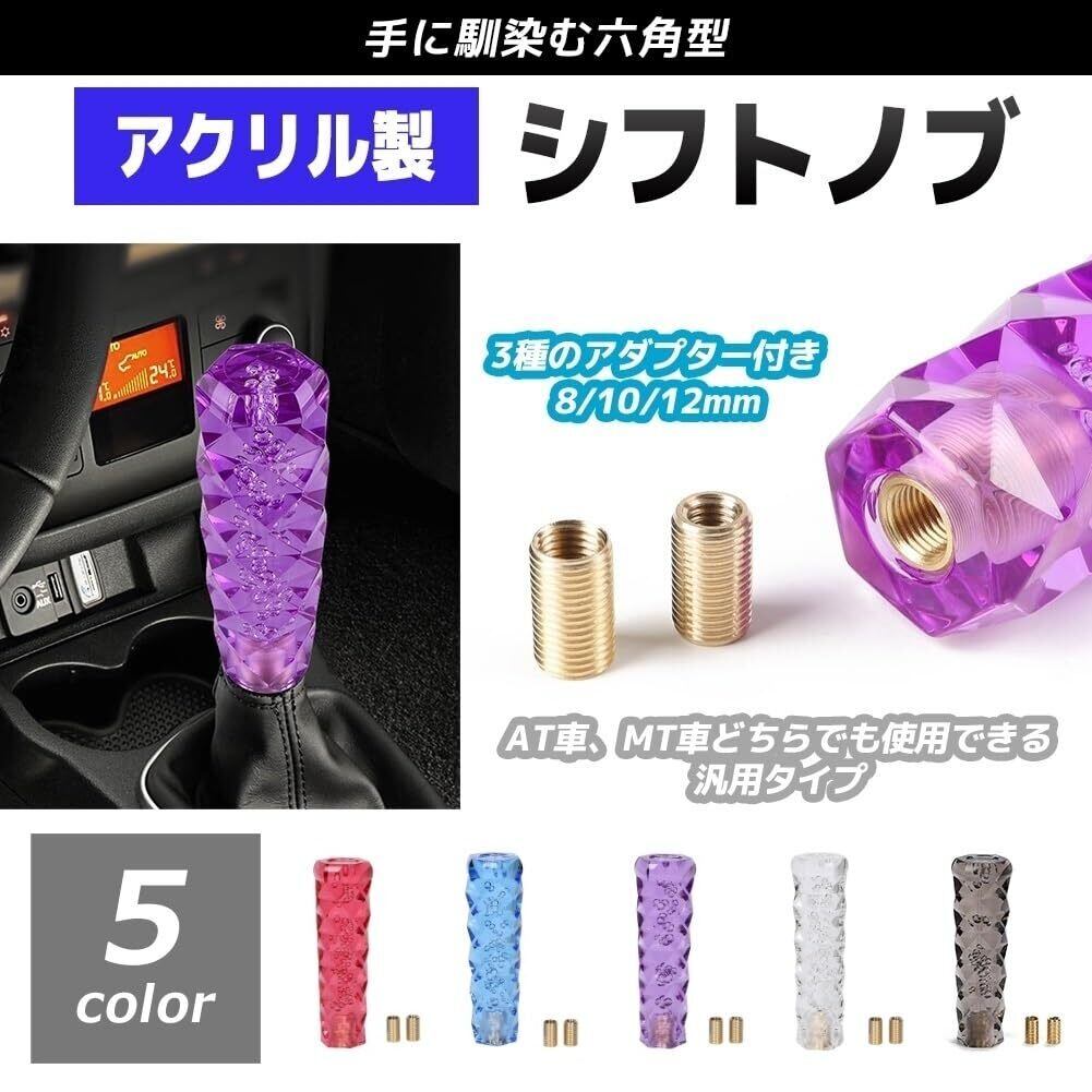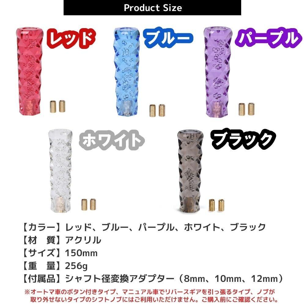 付属のアダプターで8/10/12mmのシャフト径に対応。AT車、MT車どちらでも使用できる汎用タイプです。愛車のカスタムにおすすめ、バブルの入ったクリスタルノブです。