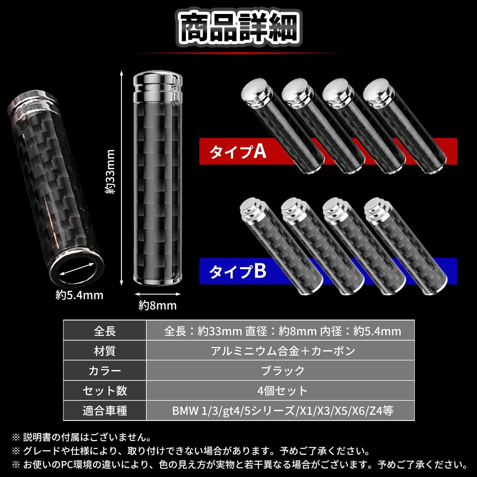 【サイズ】全長:約33mm 直径:約8mm 内径:約5.4mm 【材質】アルミニウム合金+カーボン 【カラー】ブラック 【セット数】4個セット【適合車種】BMW 1/3/gt4/5シリーズ/X1/X3/X5/X6/Z4等 ※グレードや仕様により、取り付けできない場合があります。予めご了承ください。※説明書の付属はございません。