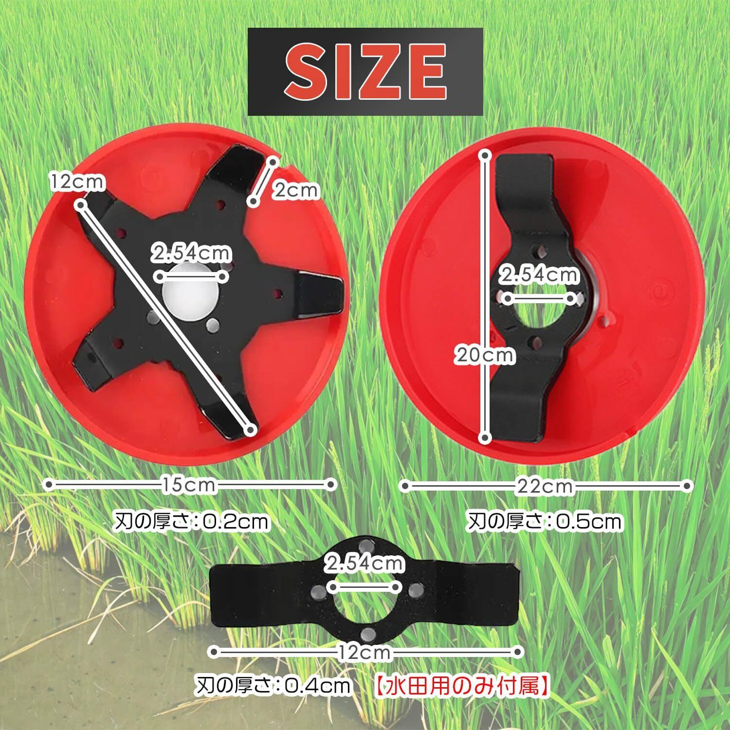 最強パフォーマンス 5枚刃(水田用)と2枚刃(陸地用)の2パターンの取り扱いがあります。驚異的な強度と耐久性を誇ります。草刈り刃は鋼を使用し、熱処理によって硬度を向上。どんな厳しい作業にも対応します。