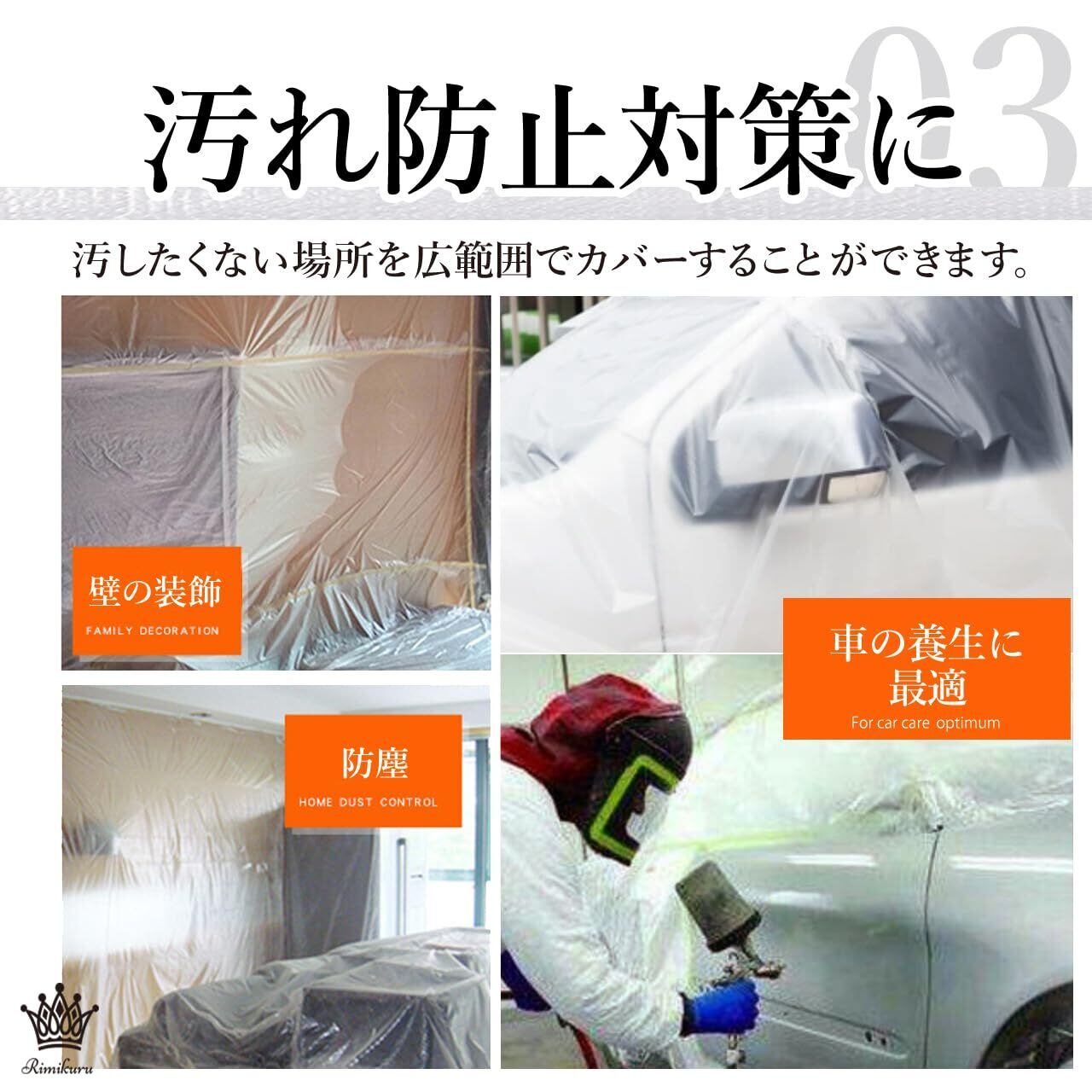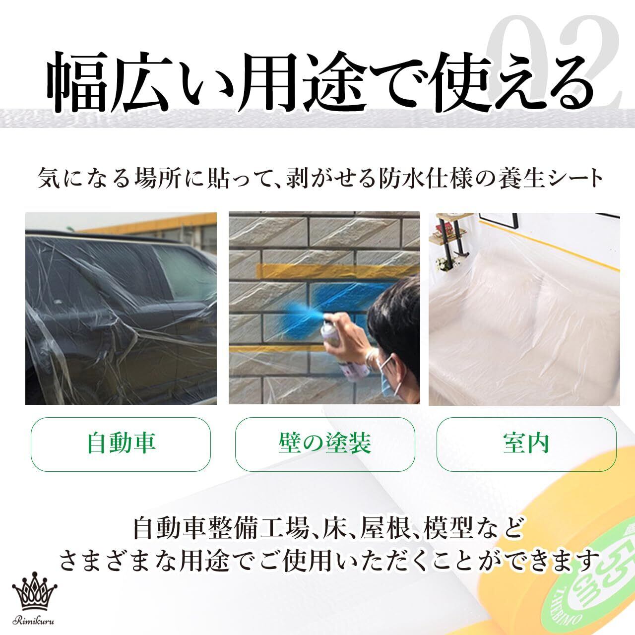 幅広い用途で使える:気になる場所に貼って、剥がせる防水仕様の養生シート マスキングテープ付きになっておりますので、室内や室外、自動車、濡らしたくない場所の養生、壁やベランダなどの塗装、エアコンの掃除、クリーニング清掃、建築現場、解体現場、自動車整備工場、床、屋根、模型などさまざまな用途でご使用いただくことができます。