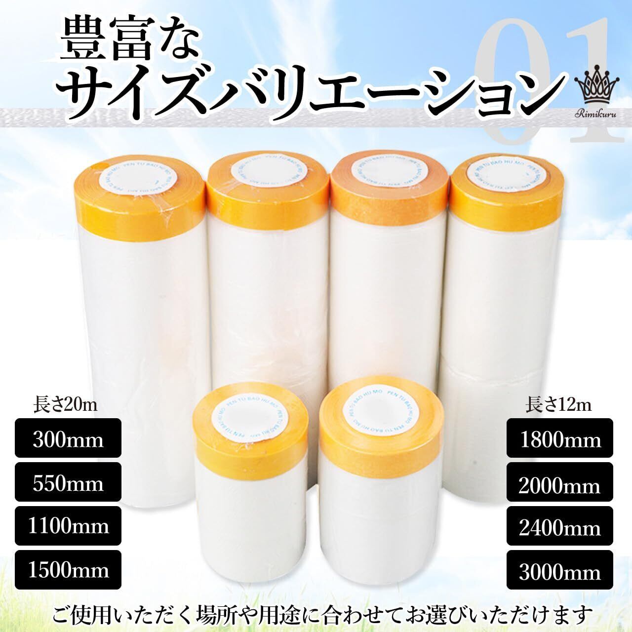 豊富なサイズバリエーション:こちらのテープ付き養生シートは幅300mm・550mm・1100mm・1500mm・1800mm・2000mm・2400mm・3000mmをご用意しましたので、ご使用いただく場所や用途に合わせてお選びいただけます。