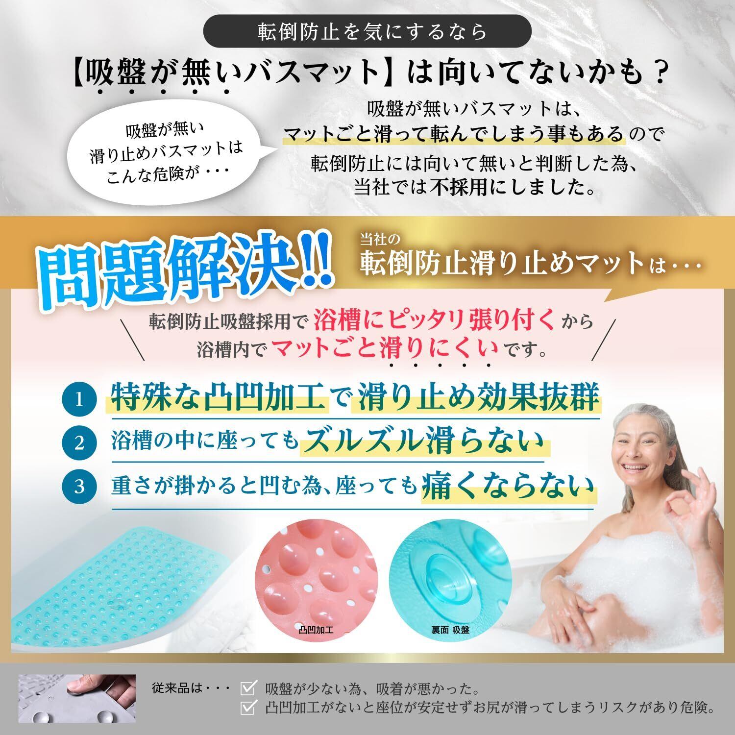 【滑り止め効果で転倒防止】 強力吸盤で浴槽浴室にしっかり吸着!表はザラザラ面と凸凹加工が施してあり滑りにくくなっています。穴が開いているので通気性にも優れていて乾きが早い為、清潔にご利用頂けます。PVC製品なのでTPE製品に比べカビ防止効果に優れています。