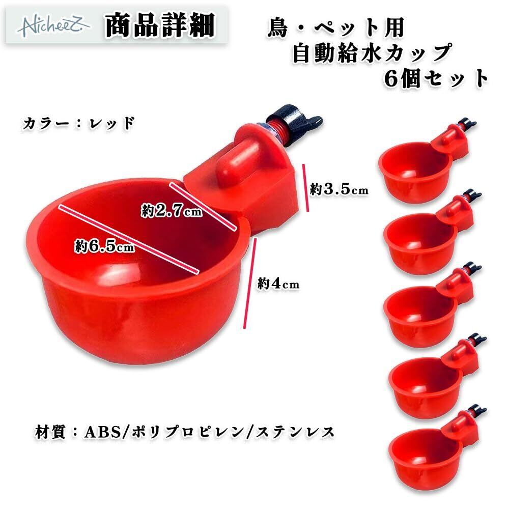 【商品内容】 鳥・ペット用自動給水カップ6個セット 材質:ABS,ポリプロピレン,ステンレス カラー:レッド サイズ:直径/約6.5cm 高さ/約4cm 取り付け部高さ/約3.5cm 取り付け部幅/約2.7cm