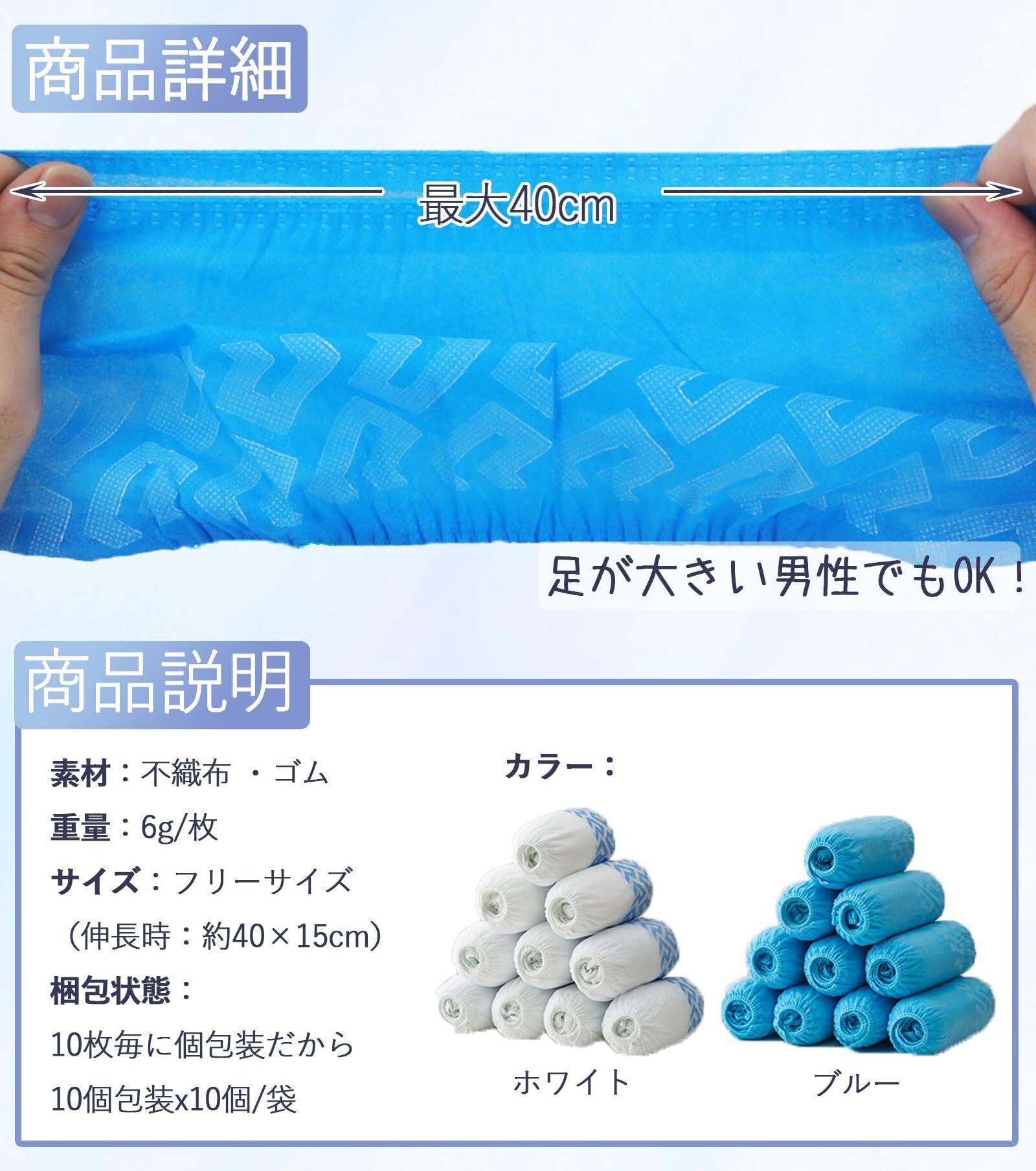 【商品仕様】セット内容:不織布靴カバー100枚(50足)。カラー:ホワイト/ブルー。サイズ:フリーサイズ。伸長時・長×高:約40×15cm。重量(約):1枚6g