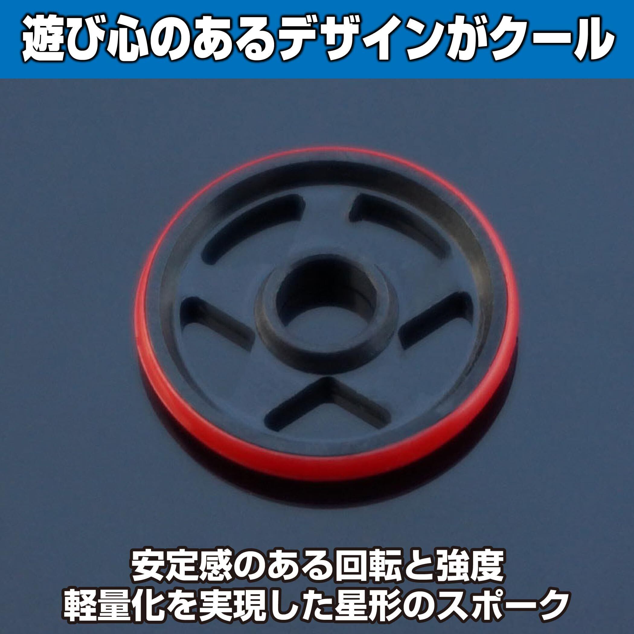 遊び心のあるデザインがクール:安定感のある回転と強度、軽量化を実現した星形のスポークは、遊び心溢れる見た目が特徴です。また車体のカラーやデザインに合わせやすいシルバー×ブルーと、ブラック×レッドの2色のセットでご用意しました。