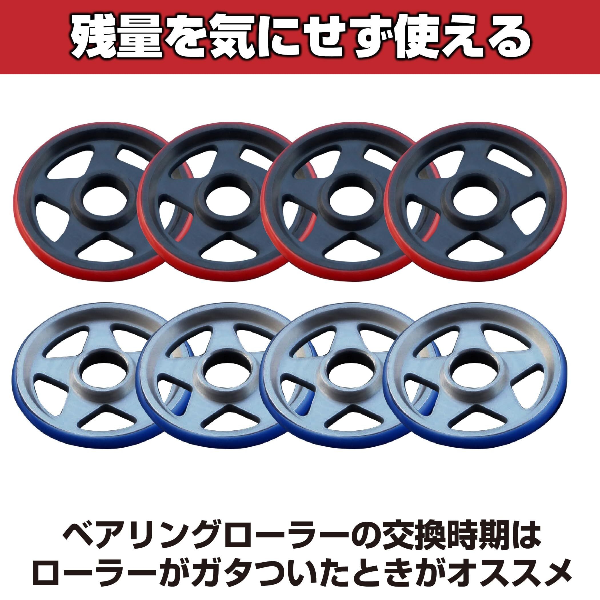 残量を気にせず使える2色8点セット:ミニ四駆のベアリングローラーの交換時期は、ローラーがガタついたときがオススメです。また、マシンの性能やコースの特徴に合わせたい時にも役立ちます。お得な2色8点セットなので、残量を気にせずお使いいただけます。