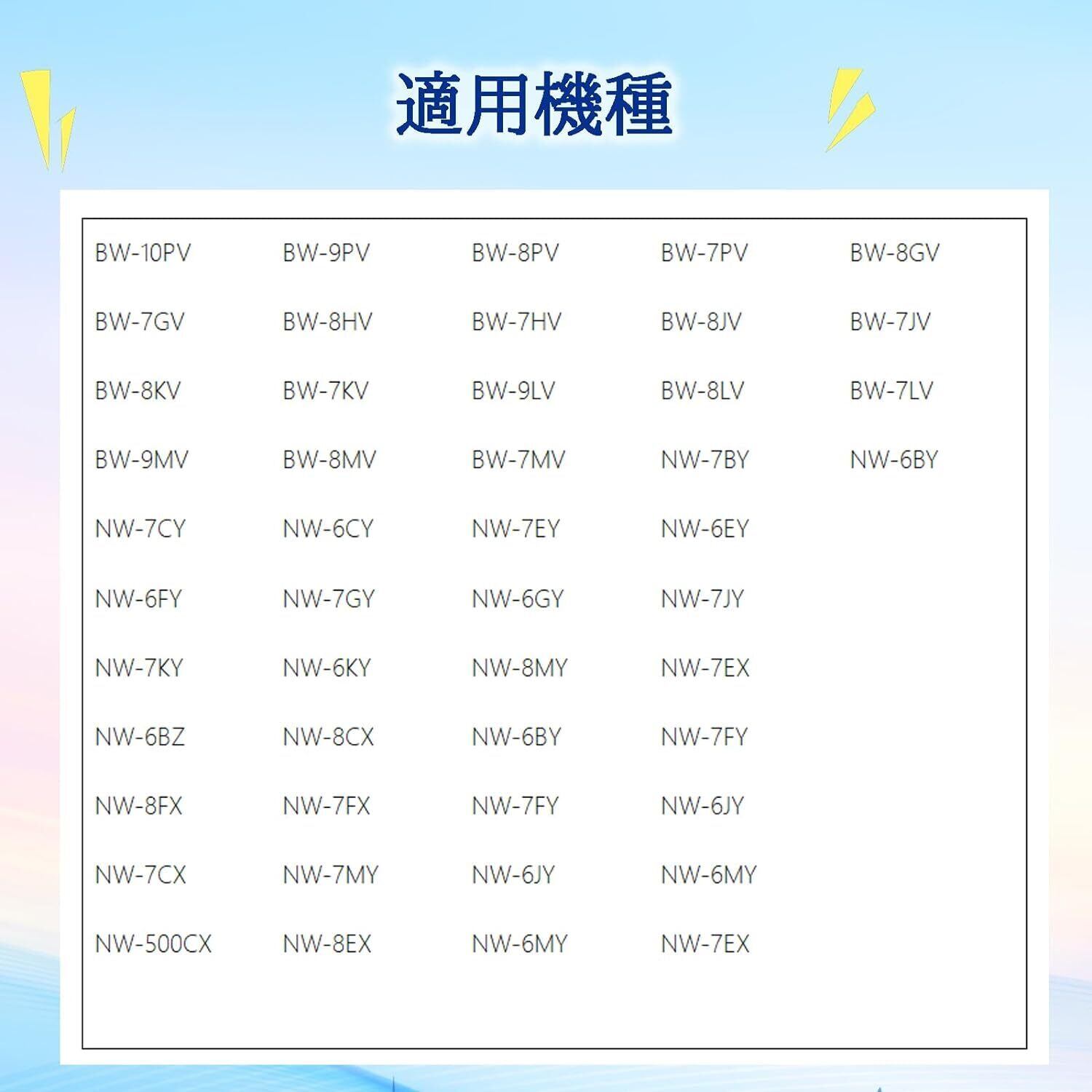 対応機種:BW-E480HV、BW-E570JV、BW-E580JV、BW-E670KV、BW-E680KV、NET-K7BY、NET-K8KV、NW-500CX、NW-500CX(A)、NW-500CX(P)、NW-6BY、NW-6BZ、NW-6CY、NW-6CY(W)、NW-6EY、NW-6FY、NW-6GY、NW-6JY、NW-6KY、NW-6MY、NW-7BY、NW-7CV6、NW-7CX、NW-7CY、NW-7CY(W)、NW-7EV7、NW-7EX、NW-7EY、NW-7FX、NW-7FXE2、NW-7FY、NW-7GY、NW-7JY、NW-7KY、NW-7MY、NW-8CV6、NW-8CX、NW-8EV7、NW-8EX、NW-8FX、NW-8FXE2、NW-8MY、NW-H60、NW-IB705、NW-KB707、NW-KB708、NW-KS7BZ、NW-R700、NW-R701、NW-R801、NW-RC7、NW-T70、NW-T71、NW-Z70、NW-Z77、NW-Z78