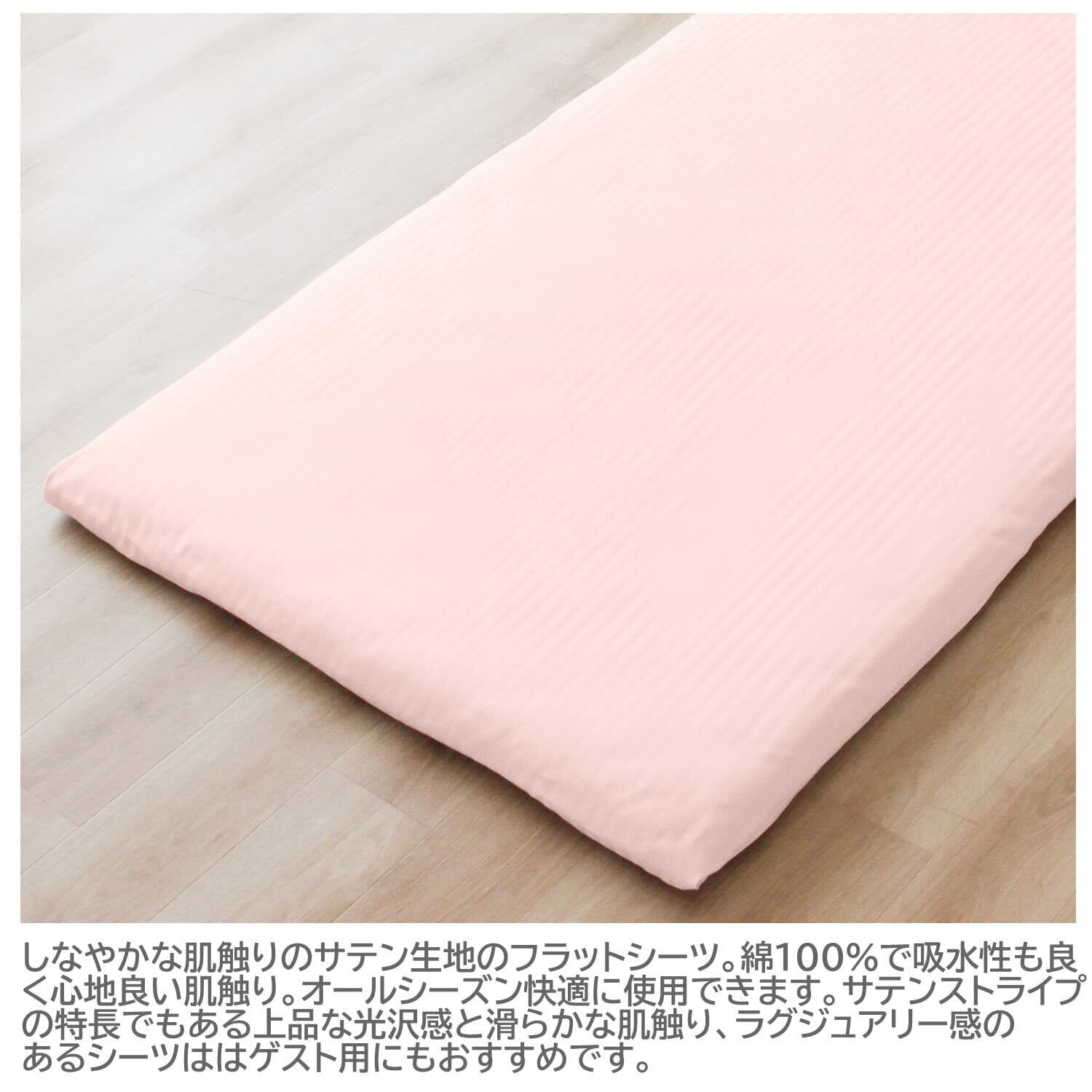 しなやかな肌触りのサテン生地のフラットシーツ。綿100%で吸水性も良く心地良い肌触りがあり、オールシーズン快適に使用できます。サテンストライプの特長でもある上品な光沢感と滑らかな肌触りでラグジュアリー感もあるのでゲスト用にもおすすめです。