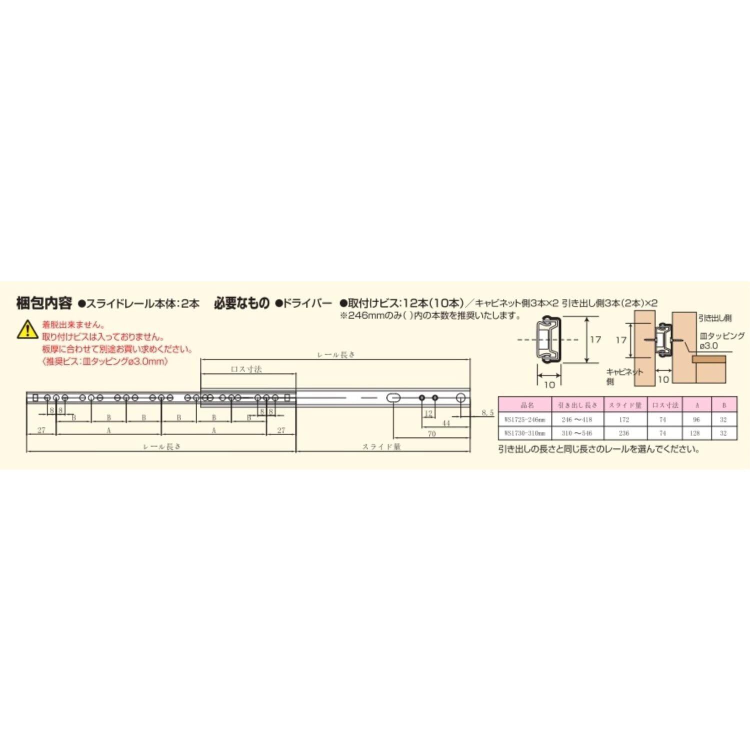 注意:引き出しの長さと同じ長さのレールを選んでください。