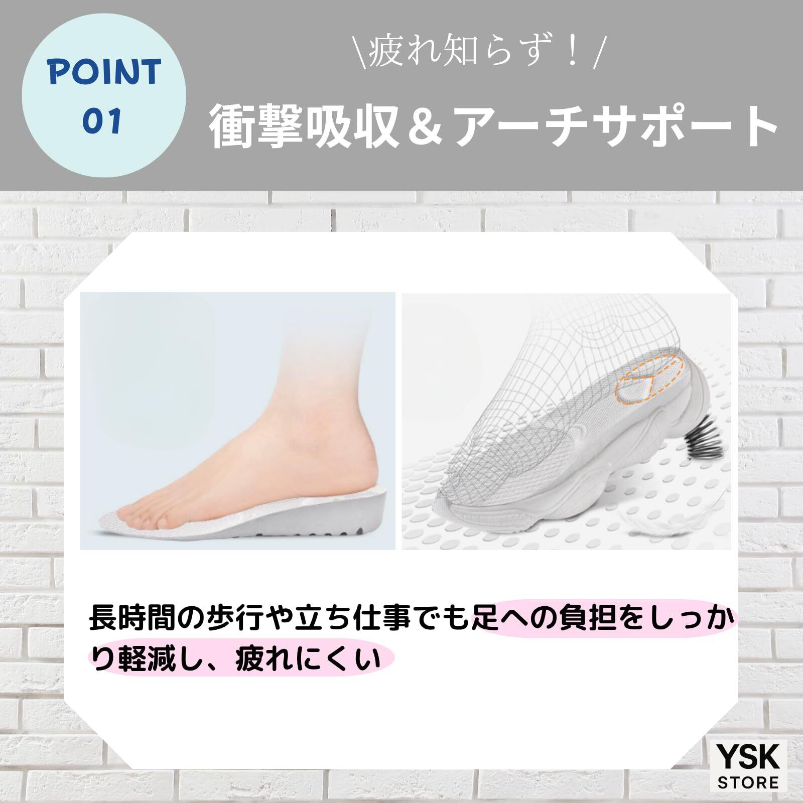 【疲れ知らず!衝撃吸収&アーチサポートで快適な履き心地】一般的な厚底中敷きと違い、このインソールは超軽量設計かつ衝撃吸収素材を採用。長時間の歩行や立ち仕事でも足への負担をしっかり軽減し、疲れにくいのが特長です。また、足裏のアーチをしっかり支える構造により、自然な姿勢をキープ。姿勢の改善や足の疲労軽減にも貢献します。普段使いはもちろん、旅行やイベントなど長時間歩く場面にも最適です。