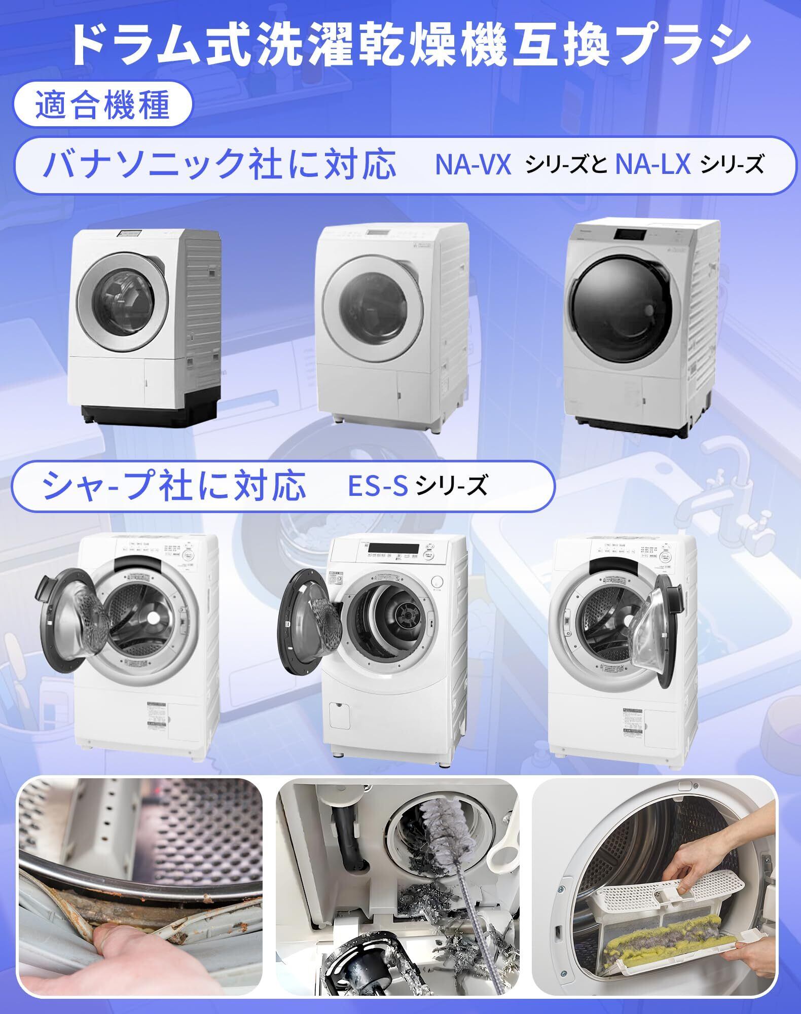 【洗濯機・乾燥機お掃除のプロ推奨商品】洗濯乾燥機専用お掃除ブラシです。パナソニック(Panasonic) AXW22R-9DA0の互換品です。パナソニック社のNA-VXシリーズ、NA-LXシリーズとシャープ社のES-Sシリーズのドラム式洗濯機乾燥機に対応可能。洗濯機内部や乾燥経路、排気口などのホコリや汚れを”ごっそり”取り除くお掃除ブラシです。