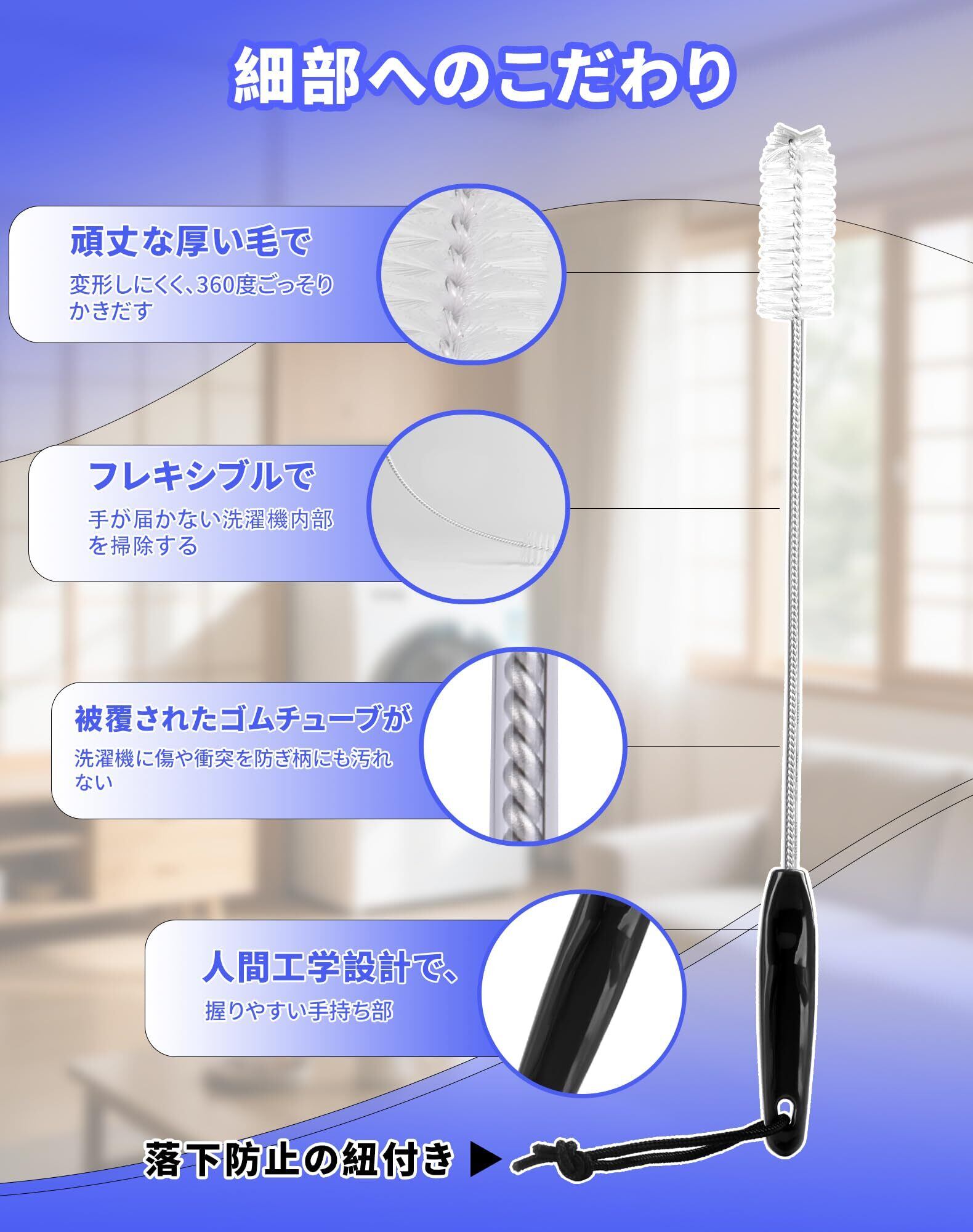 【細部へのこだわり】乾燥機 掃除 ブラシはフレキシブル柄で、奥まで押し込んでも針金でフレシキブルに曲がりますが、適度なしなりがあるので、掃除がしやすいです。洗濯機ブラシの針金部分は、上質なビニールチューブで包まれており、洗濯機本体に傷つけることもなく大事な洗濯機を傷から守ります。 。洗濯乾燥機 ブラシは握りやすい持ち手で人間工学に基づいた持ち手デザインで、手にしっかりフィットし、操作性が向上しています。