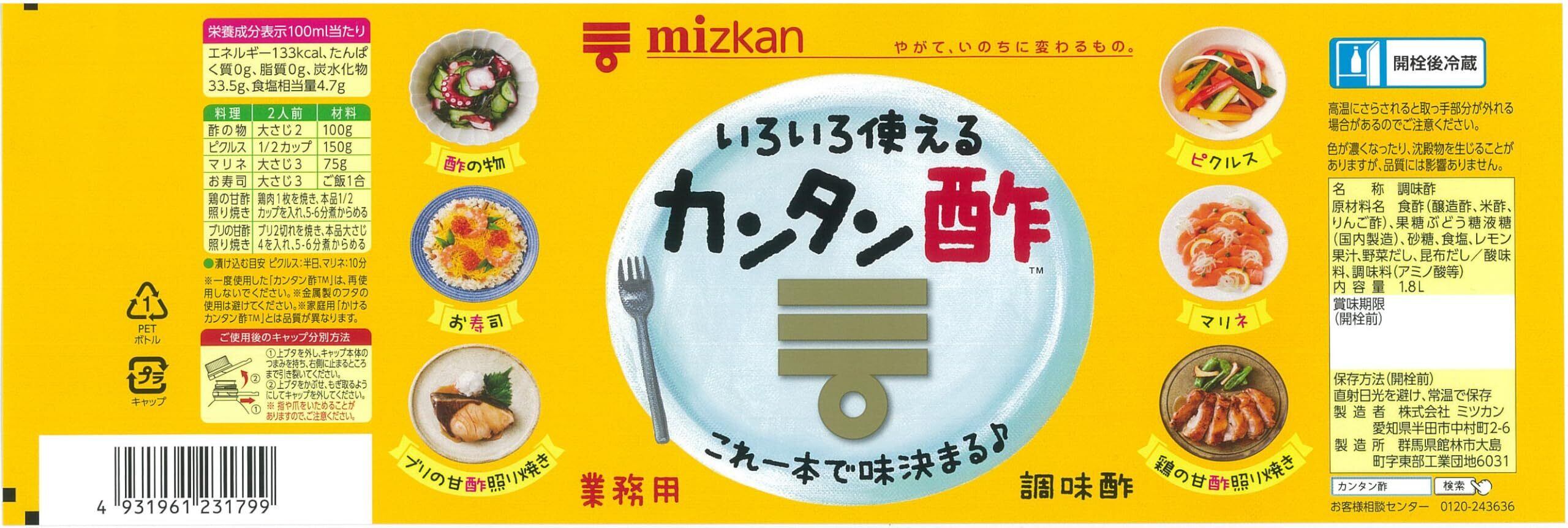これ1本で、甘酢漬け、酢の物、お寿司、ピクルス、マリネ、肉料理など、いろいろなお酢メニューがカンタンに作れる調味酢です。砂糖、食塩などを合せる必要がないので、料理の苦手な方でも簡単においしくお酢メニューを作ることができます。1.8Lペットボトルタイプとなります。