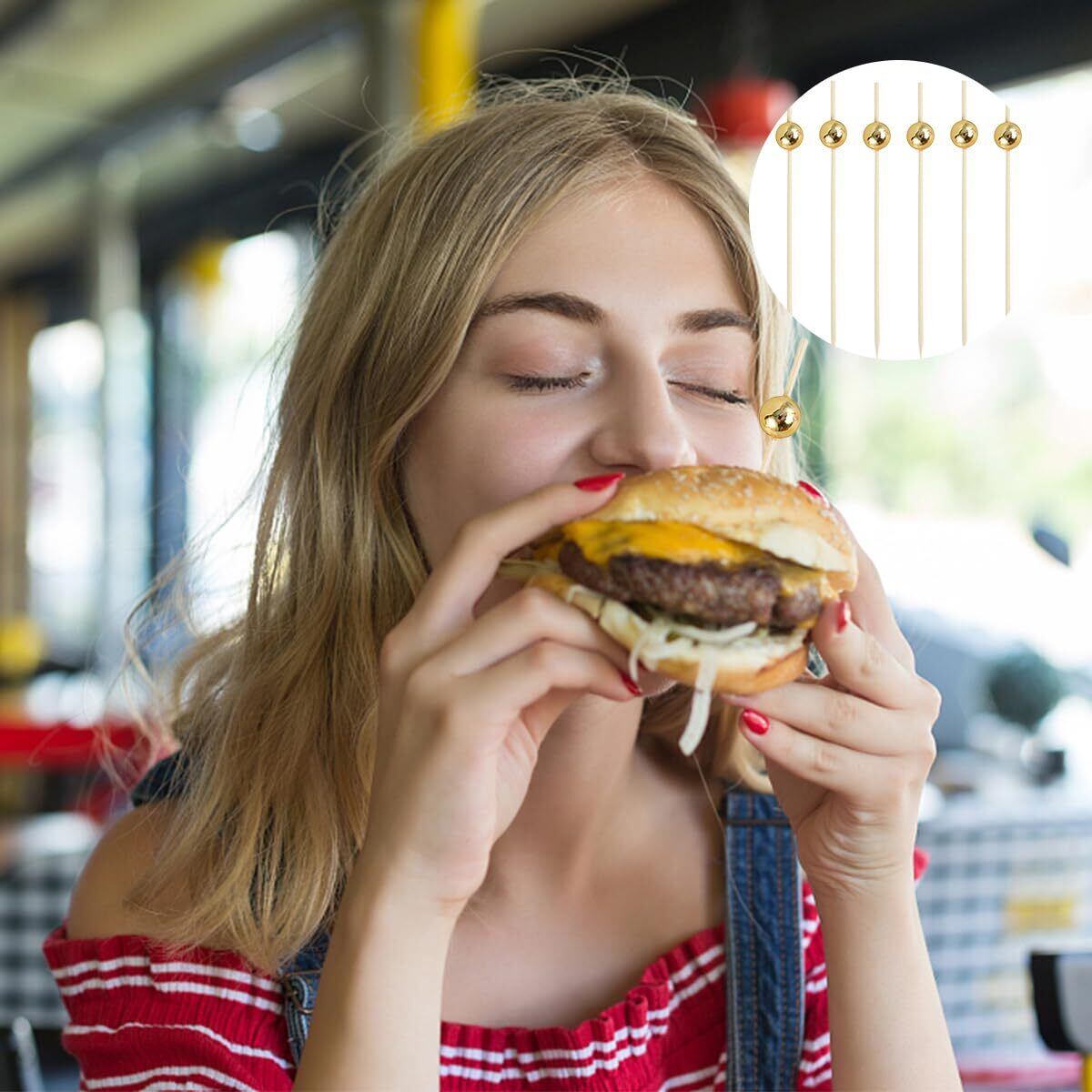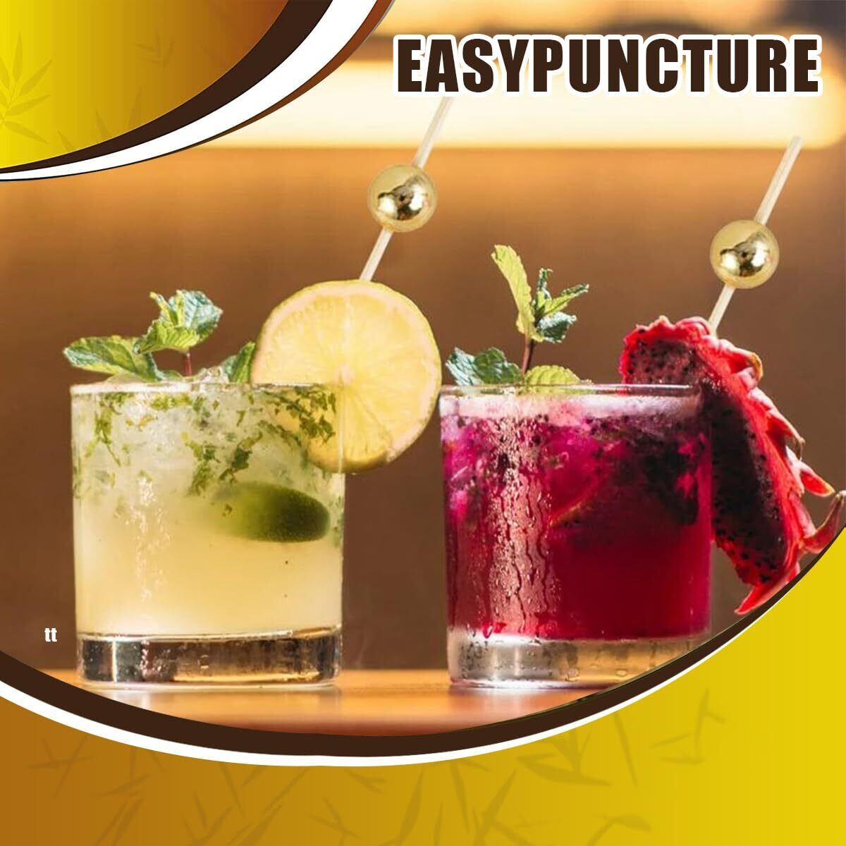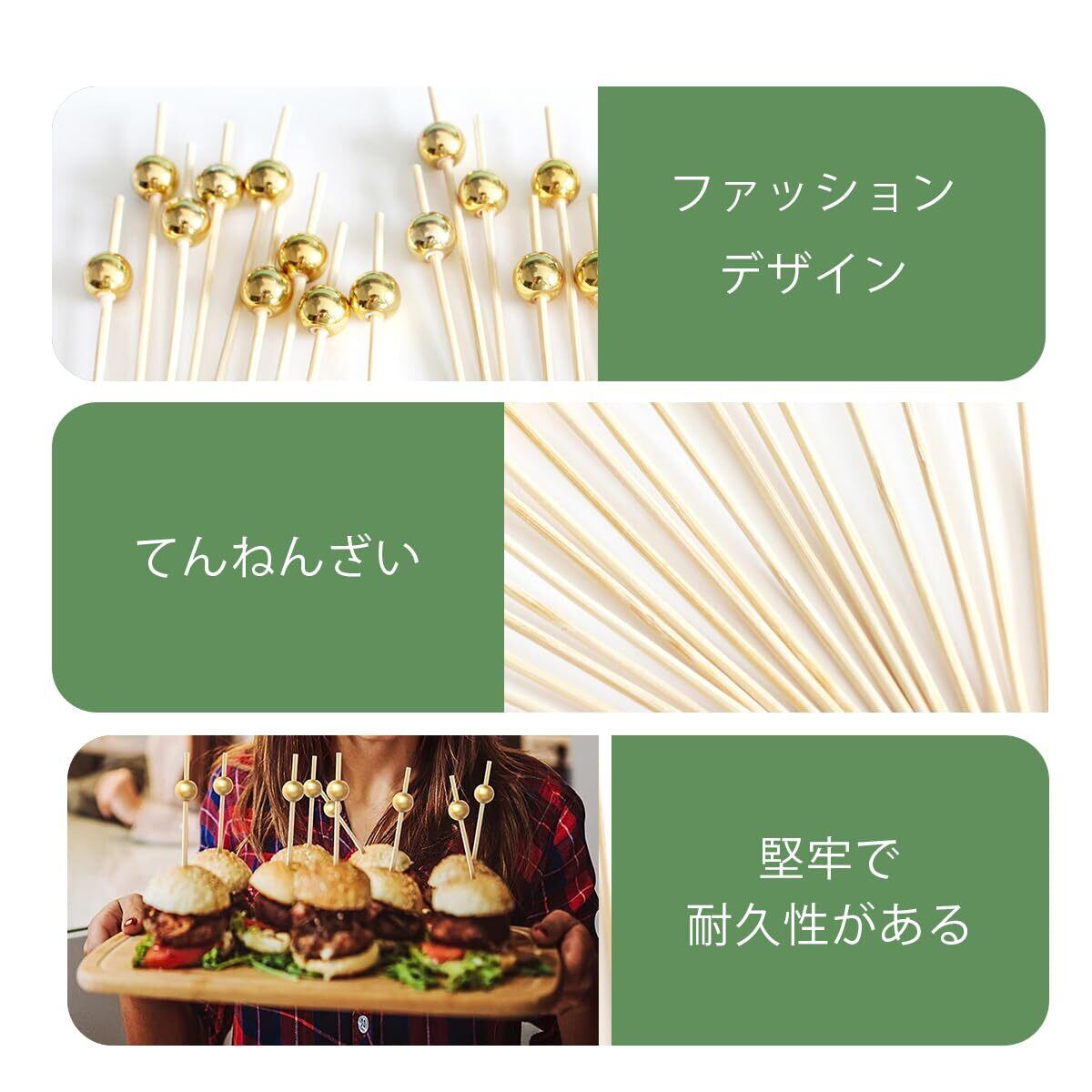 【カクテルピック】おしゃれなゴールドビーズが飾るカクテルピックです。シンプルで実用的なデザインで、食べ物の盛り付けにファッション感を加えることができます。 【高品質の素材】竹製フルーツピックは滑らかでバリがなく、握りやすく、快適な使用感をもたらします。先端が鋭くて使いやすいです。 【サイズ】全長約12cm。ちょうどいいサイズで、カクテル、ドリンク、フルーツ、野菜、前菜ピック、デザートなどに最適です。ミニ串を作ることもできます。 【適用場合】日常的に使用したり、パーティに供給したりするのに十分です。誕生日、結婚式、クリスマス、パーティー、バーベキュー、バーなどに欠かせないアイテムです。 【パッケージ】カクテルピック190本セット。