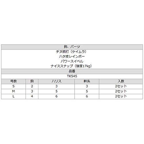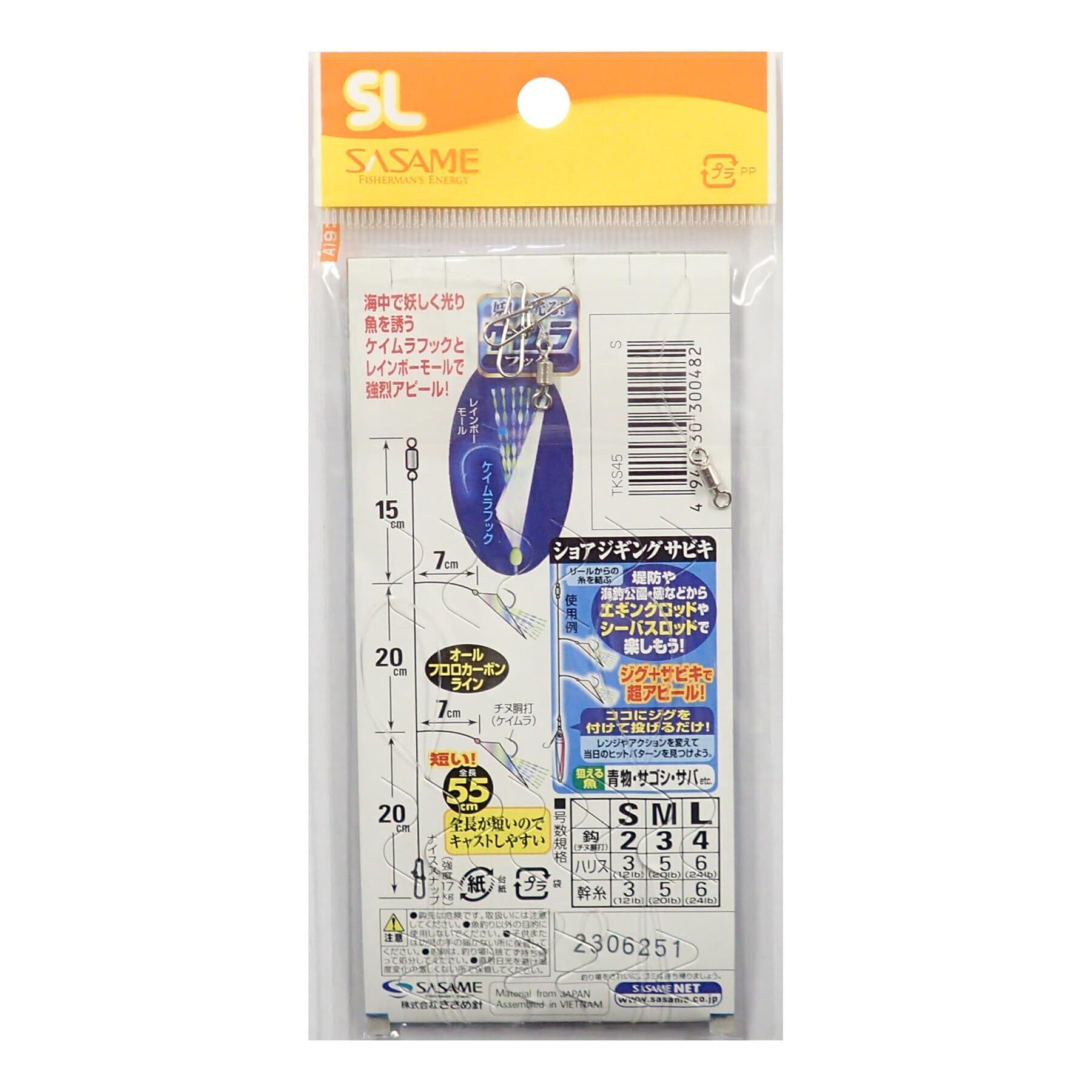 SASAME TKS45 Special SL Shore Jigging Sabiki Egging Seabass Rod makes it easy to enjoy from the embankment! Mayura works! Easy to cast. Total length 21.7 inches (55 cm) is an intense appeal with the Kamura Hook and Rainbow Mall. ささめ針(SASAME) TKS45 特選SLショアジギングサビキ! ! エギング・シーバスロッドで堤防から簡単に楽しめる! ケイムラが効く! キャストしやすい短い! 全長55cm海中で妖しく光り魚を誘うケイムラフックとレインボーモールで強烈アピール! SASAME(SASAME) TKS45 特选SL岸钓 SABIKIRING SABIKI!! 通过抽鱿鱼钩,可以轻松地享受防堤! Kamura有效! 易于投掷! 全长55厘米在海中诱人鱼的鱼钩和彩虹小鱼,强烈的吸引力!
