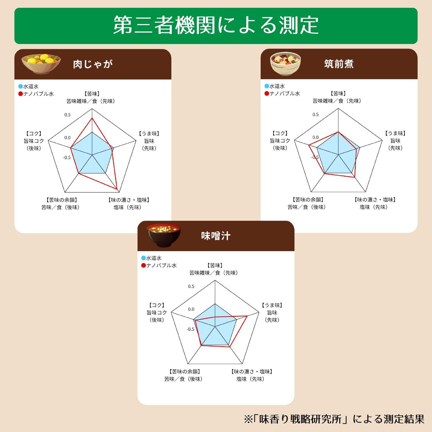 ナノバブル水で減塩と美味さを両立! キッチン専用のナノバブールが登場!! ナノバブール キッチンを取り付けるだけでいつもの調理方法で料理がより美味く さらに減塩効果や時短ができる 料理研究家6名のうち、5名が高評価レビュー 変換アダプター4種類付き ・M22x1 外ネジ用 ・M24x1 内ネジ用 ・W2320 内ネジ用 ・16mm 自在水栓パイプ用 本体:ポリアセタール ナノバブル発生器:ポリプロピレン 製品サイズ:4.6x4.6x6.2cm 製品重量:38g 付属品:変換アダプター、レシピブック 日本製 ※耐用年数:3年 ※期間:お買い上げ日より1年間
