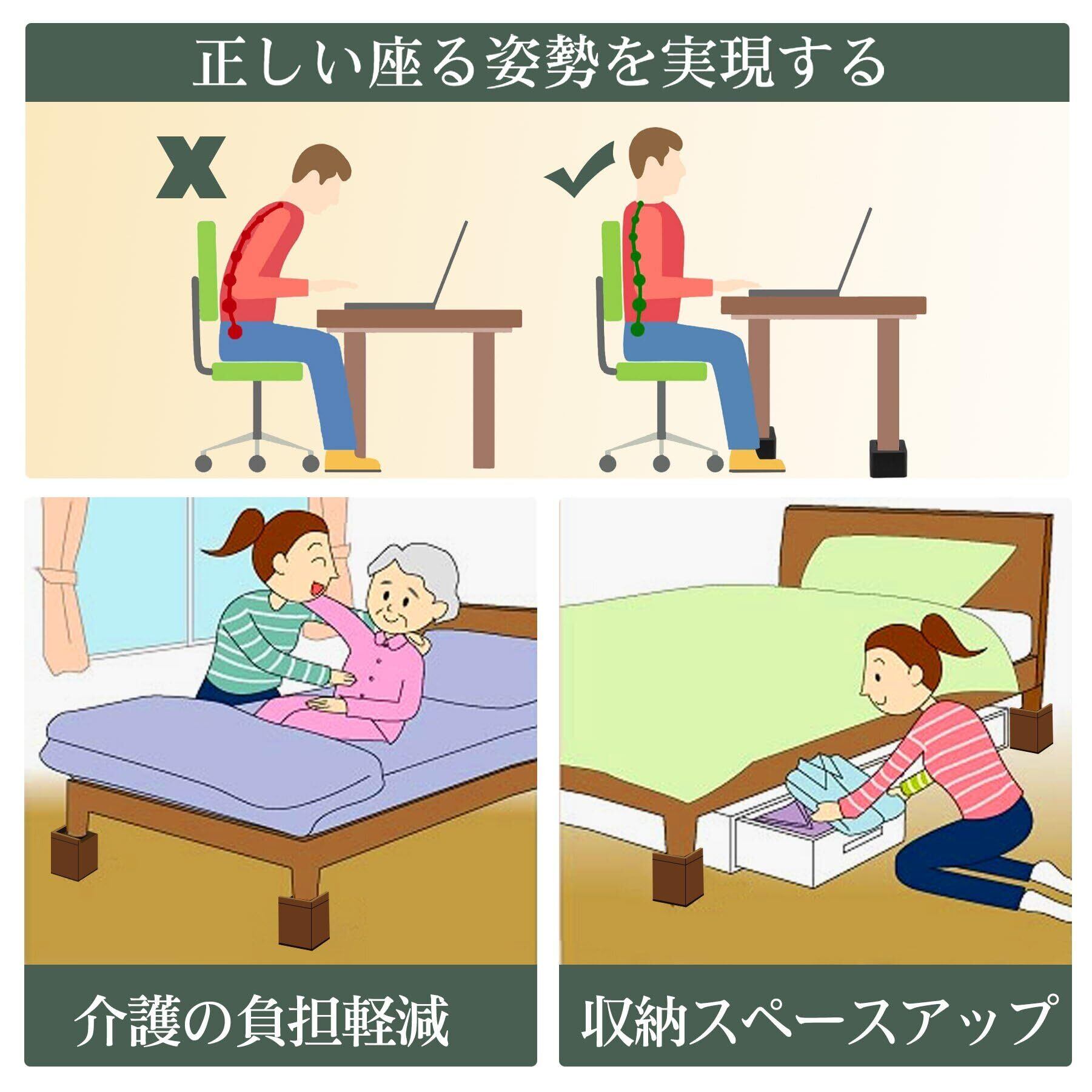 【使用効果】家具の脚を簡単に高くすることではなく、スペースをプラスし、掃除もらくになり、高齢者にとって助けナシでベッドから出れます。収納力アップももちろんアップします。