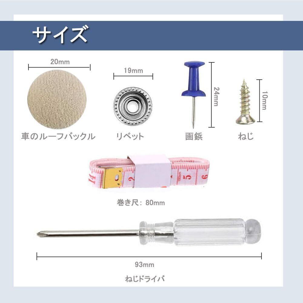 【セット内容】自動車ルーフロッ*60個、画鋲*30個、ねじ*60個、リベット*60個、ねじりピン*60個、ねじドライバ*1個、巻き尺*1。