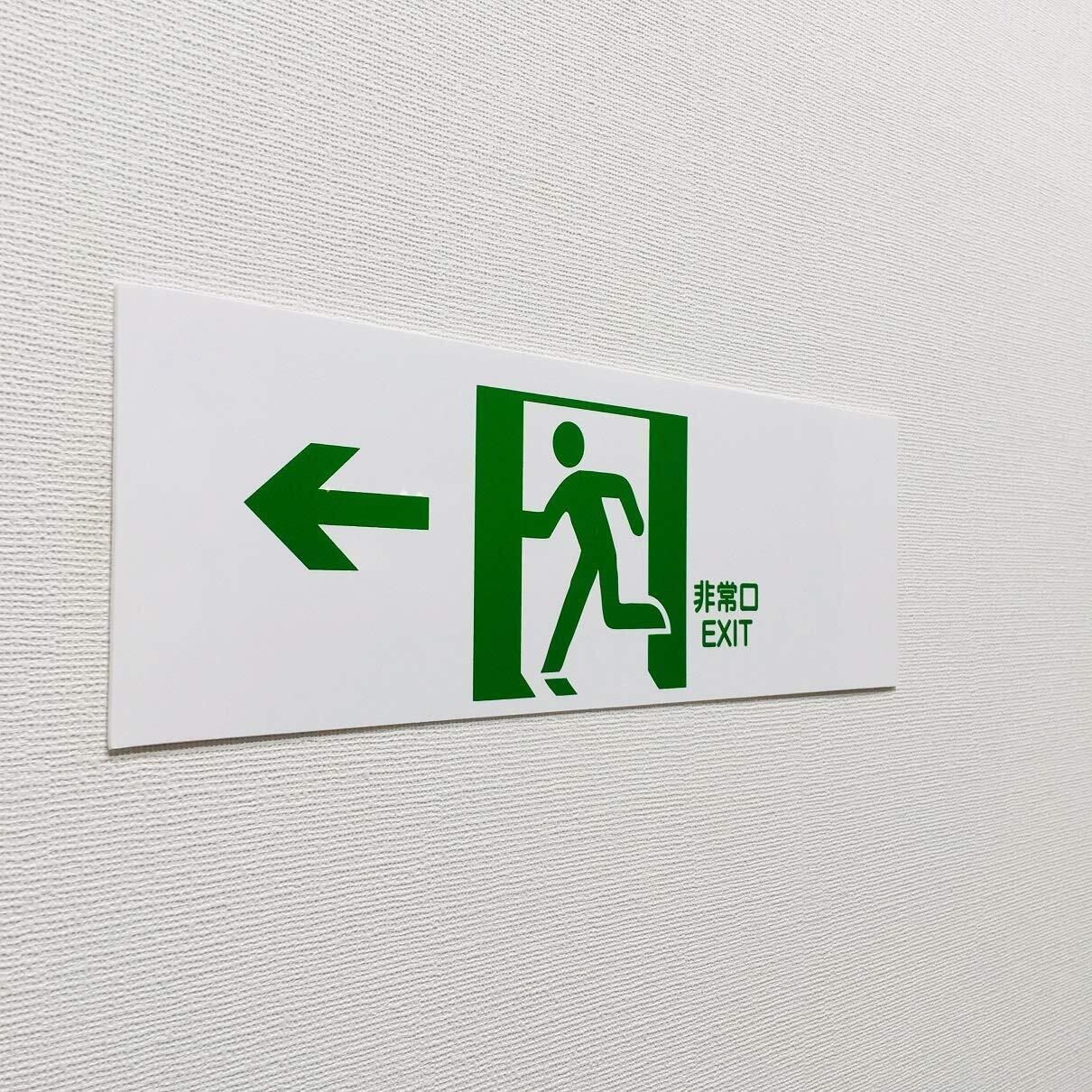 避難誘導標識プレート 非常口 EXIT(←左方向)白地に緑抜き絵文字 縦x横120x360mm PP 厚さ1mm ※蓄光タイプではありません