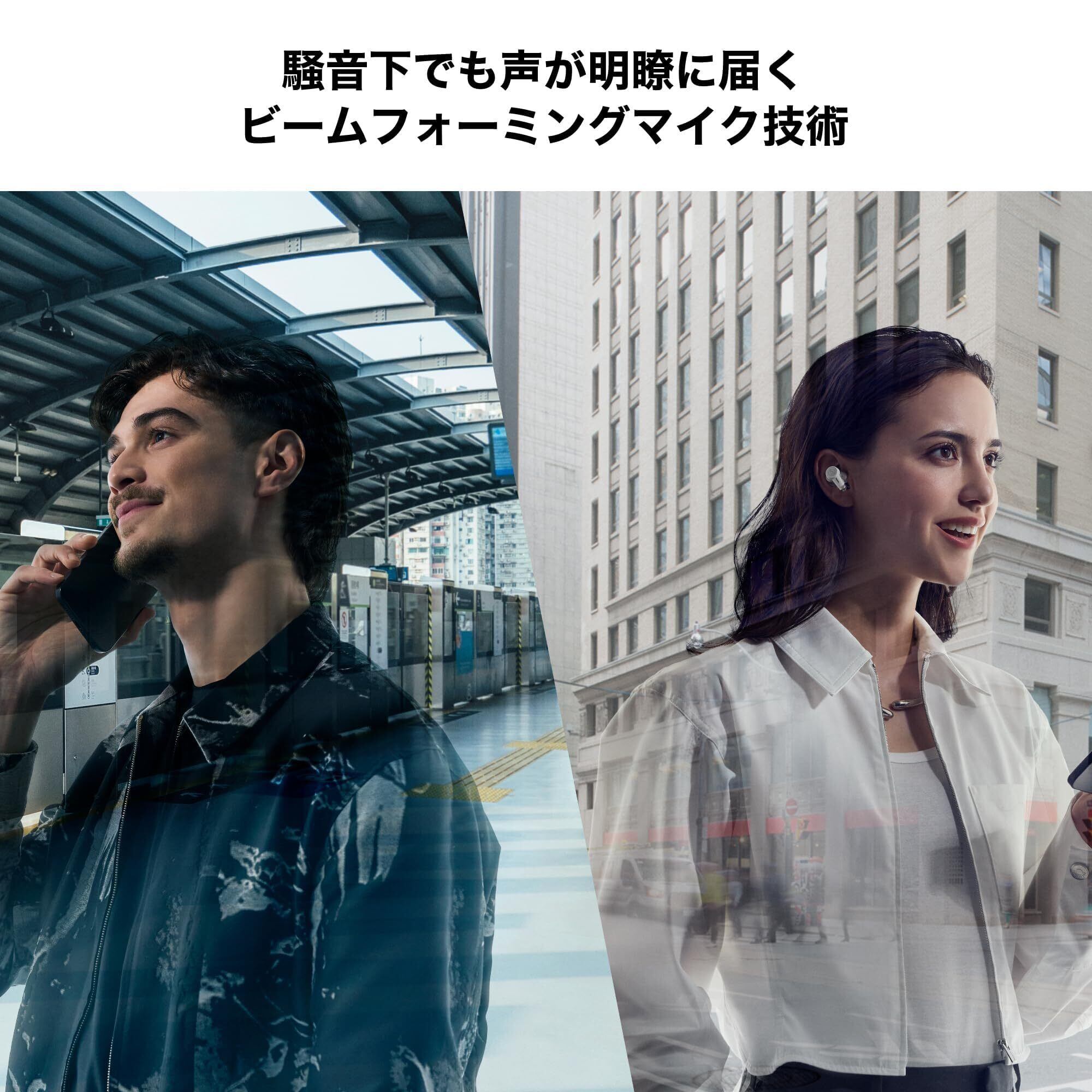 様々なシーンでニュアンスまで伝わる、確かな通話性能:イヤホン筐体の2 カ所に配置された小型の高性能MEMSマイクを利用したビームフォーミングマイク技術により、話者の口元に向かって指向性を持たせ、声を的確に収音し、周囲の雑音が多い環境にあっても相手に明瞭な声を届けることができます。