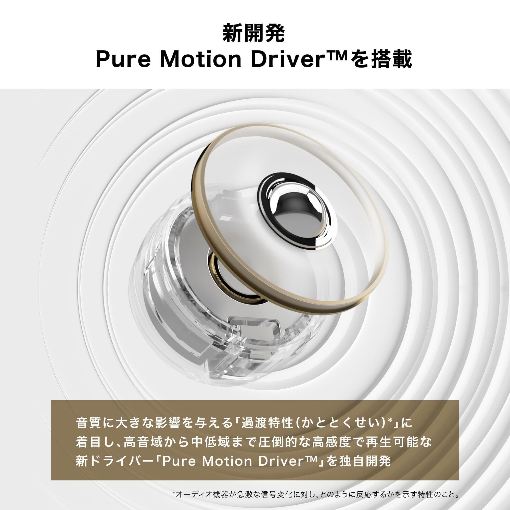 技適マーク認証済み商品(周波数帯:2.4GHz帯) ハイレゾ新時代に対応するPure Motion Driverを新規開発:音質に大きな影響を与える「過渡特性」に着目し、高音域から中低域まで圧倒的な高感度で再生可能な新ドライバー「Pure Motion Driver」を開発しました。全てを描き出す解像度の高い表現力により、アーティストやクリエイターの伝えたい音や人の想いを、余すことなく体感することができます。