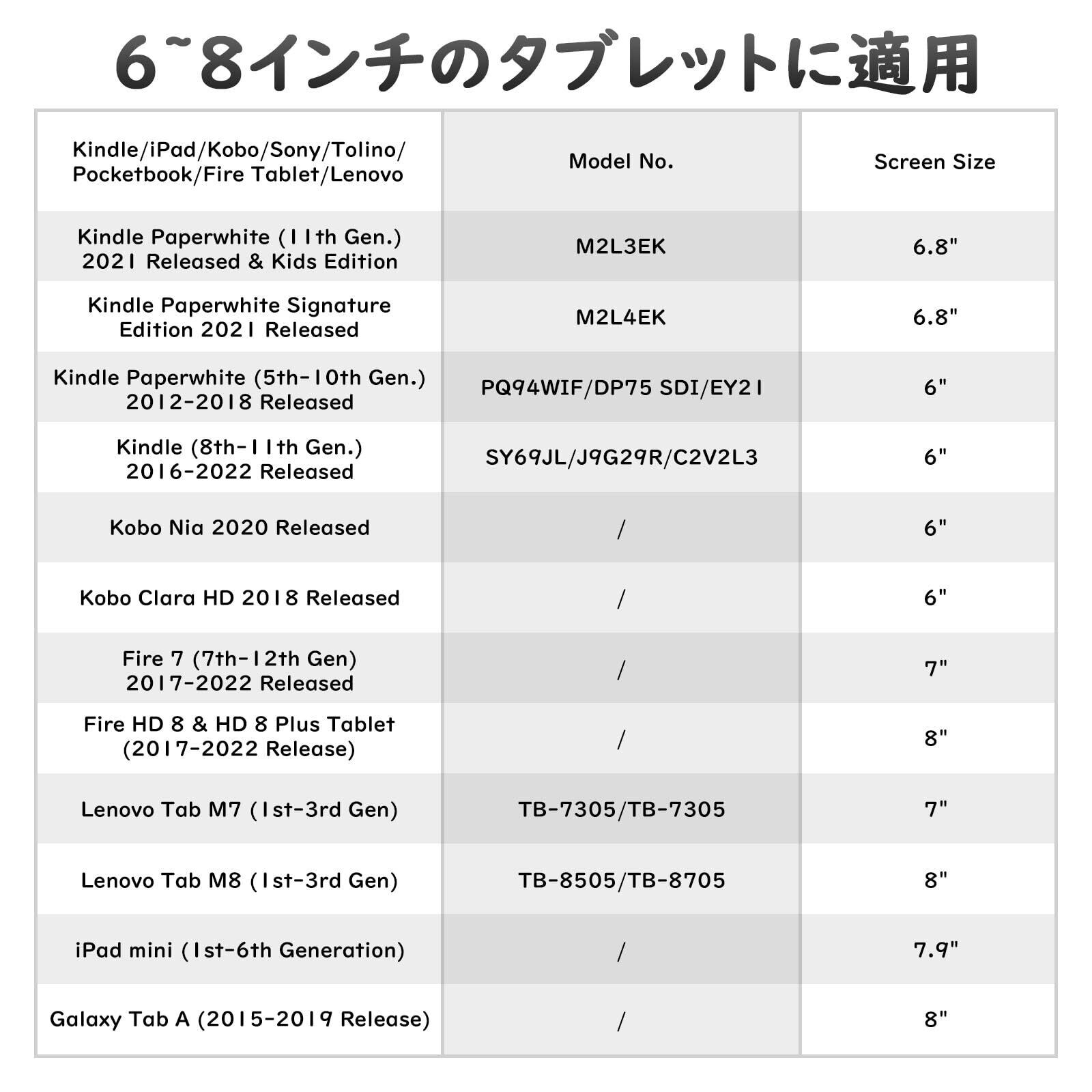 「機種幅広く対応」弾力性の高いゴム製のため、iPad Mini 第7/6/5/4/3/2/1世代、Kindle Paperwhite 2024/2021/2018、Fire7 2022/2019、Fire HD 8 & 8 Plus 2024/2020など等6~8インチタブレットに幅広く対応しております。厚めの保護ケースを付けられた場合は本製品を取り付けられない可能性がありますので、保護ケースを外して、または薄型のケースを付けて本製品をご利用ください。