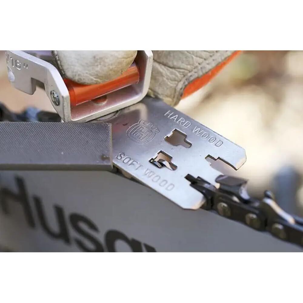 丸やすりと平やすりを使い、正しい目立て角度を保ちながら目立てを行える